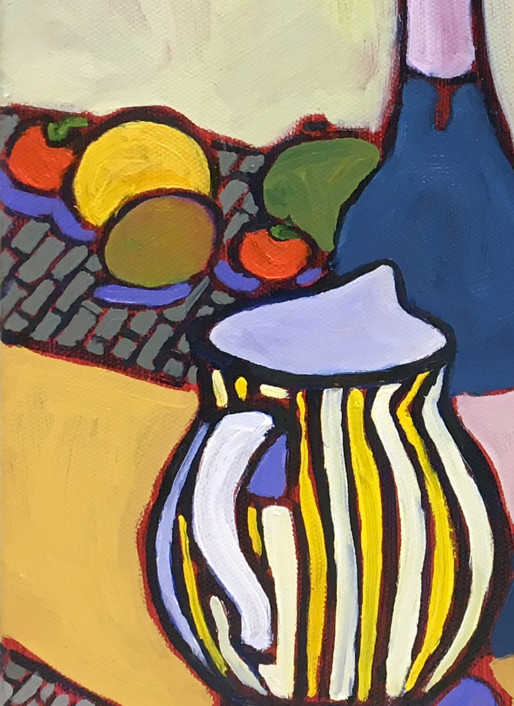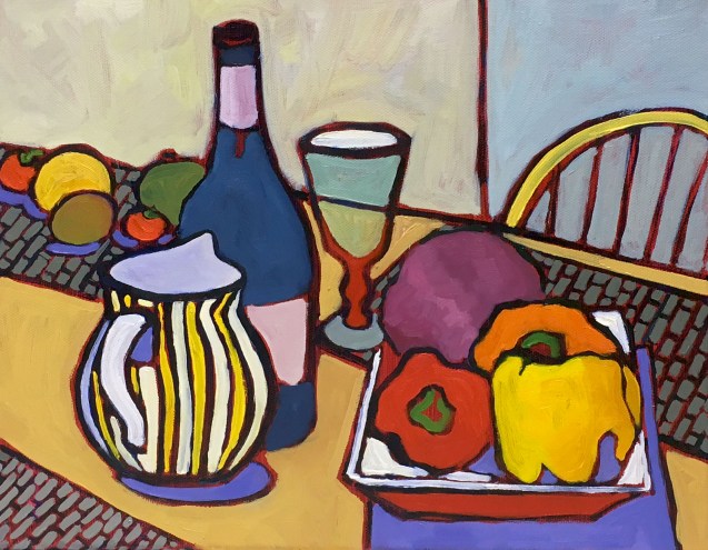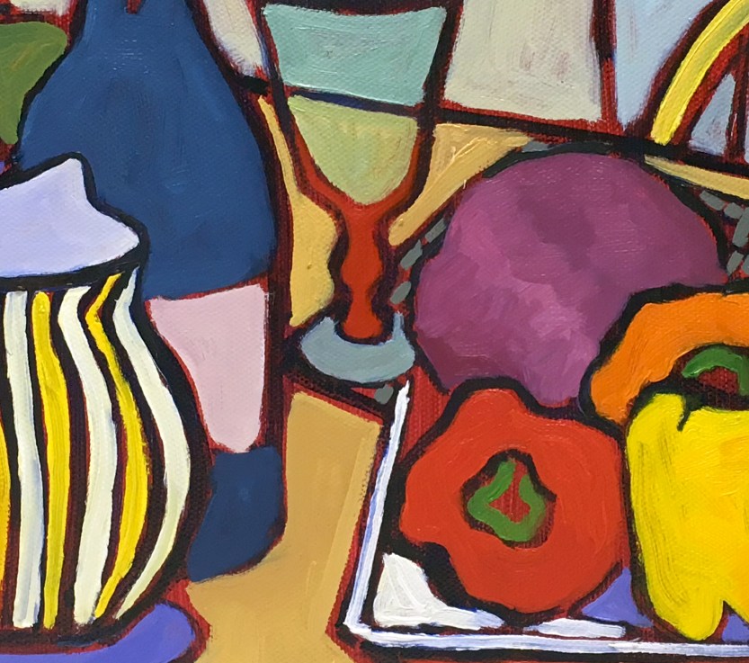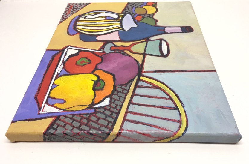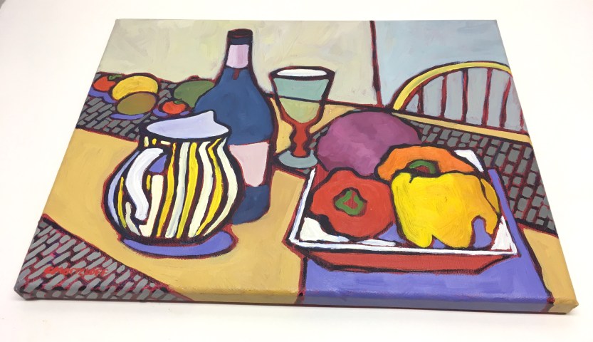 This still life oil painting was created at a friends house in a beautiful sunroom right off her kitchen. The large farm table and chairs were so welcoming. In preparation for us to paint an eclectic mix of wonderful things had been put out to work with. Fruits, vegetables, wine, glassware, and colorful ceramic pieces all there for the imagination. I got sucked into the colors immediately! I loved the large peppers in red, orange and yellow along with a purple cabbage. Those items popped dramatically on the white tray they rested upon.
