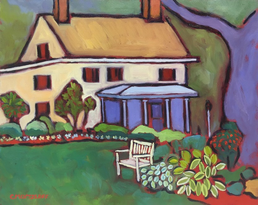 It took me awhile to find a spot to paint as there were so many interesting vistas to choose from. What I ended up being drawn to was the home itself and focusing on that with the landscape as an accent. The painting took awhile to get off the ground as I wiped things out several times before I saw something emerge that felt right. With a whimsical flair and bit of abstraction the painting slowly came to fruition. It was nice to take a few breaks and enjoy the grounds and awesome treats the homeowners had prepared. There were a lot of people throughout the morning and afternoon walking through marveling at all the flowers and plants.