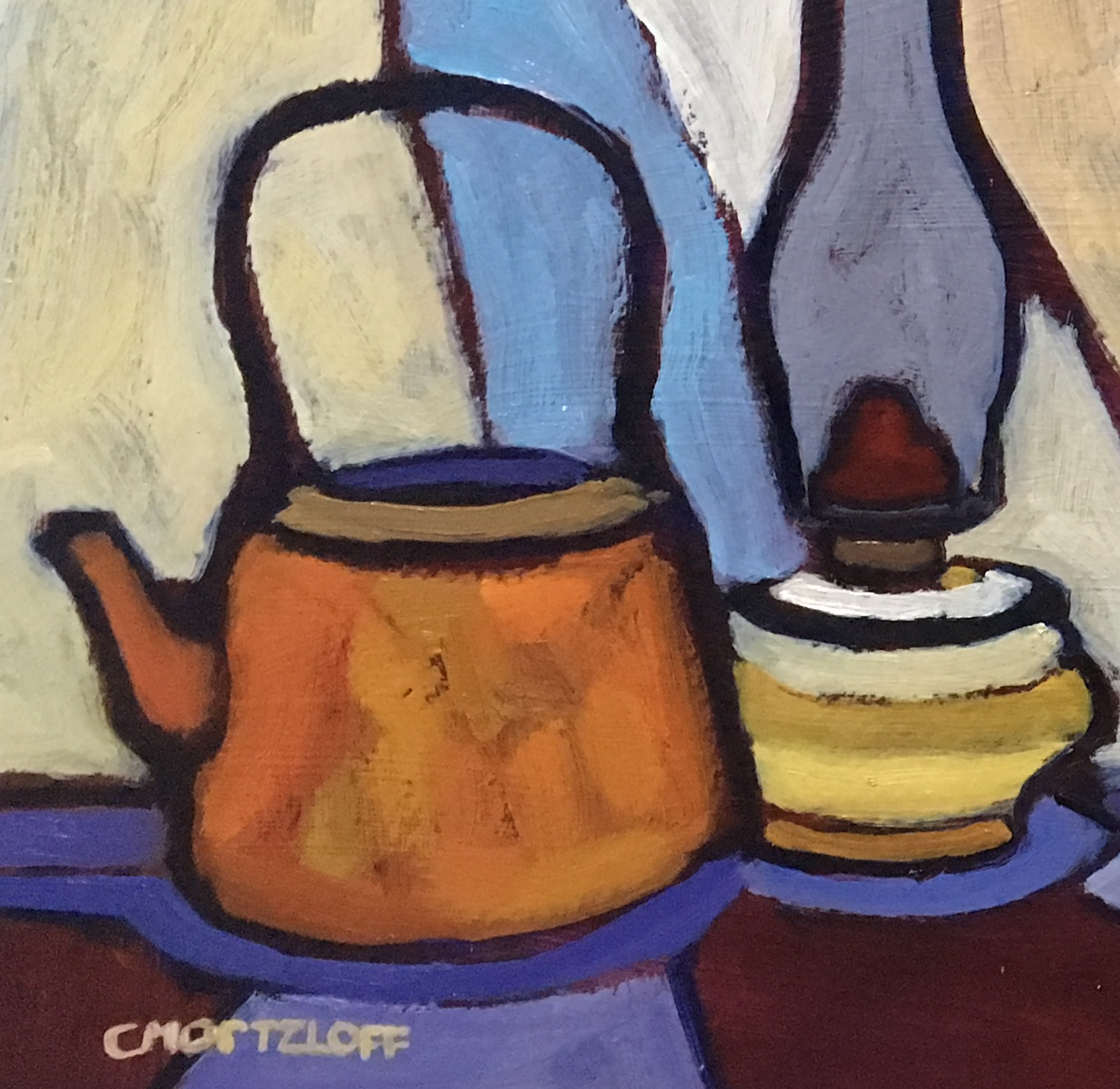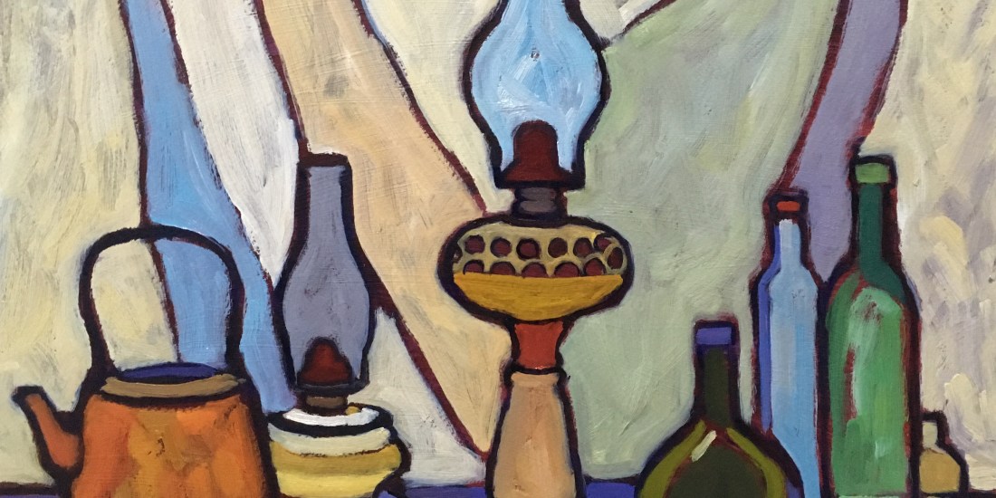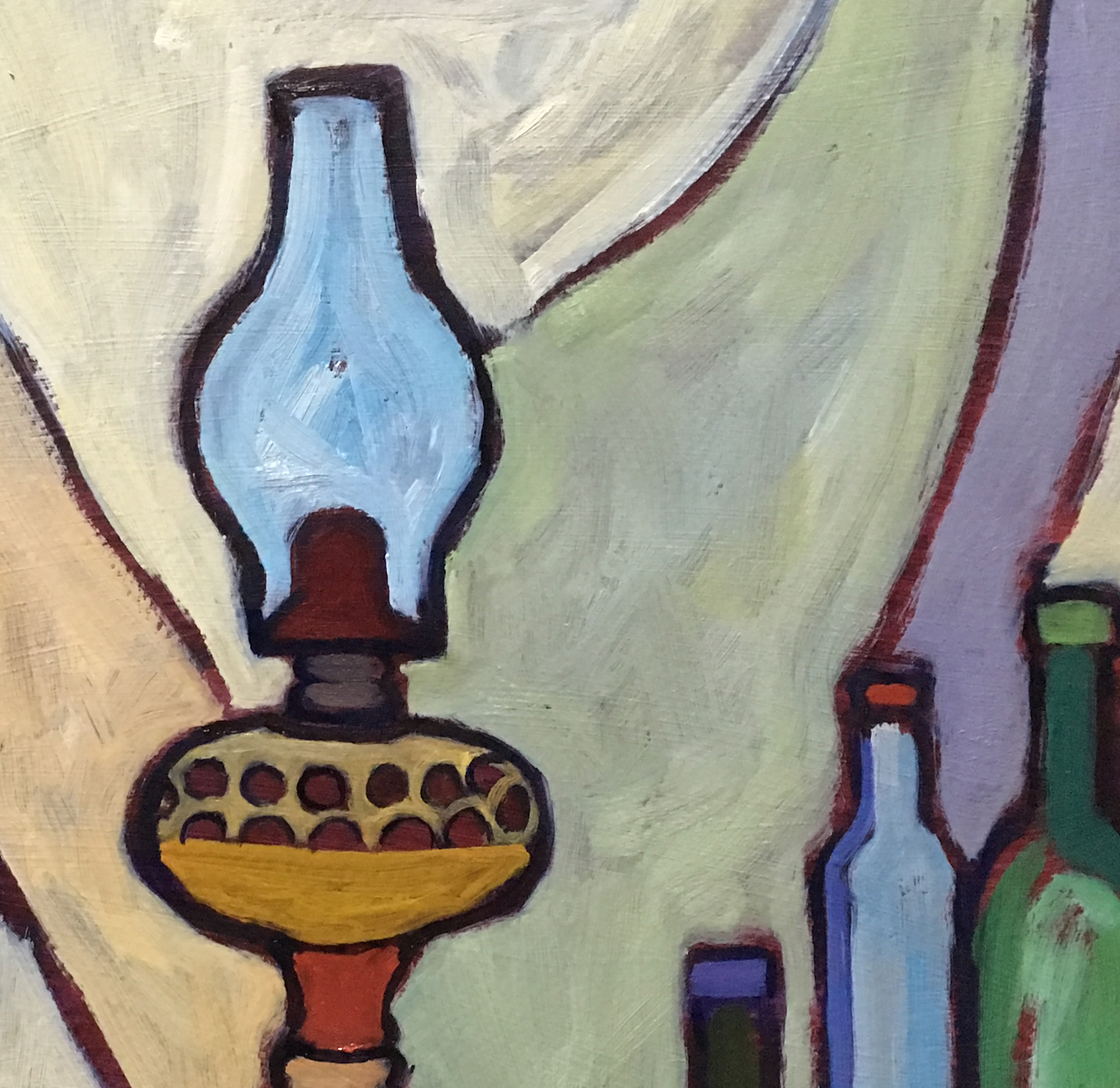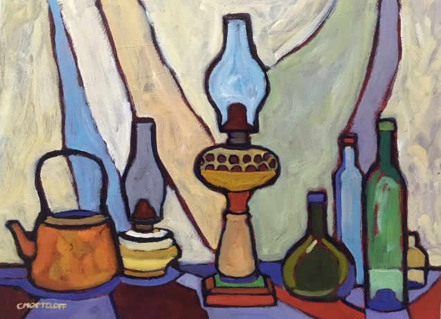 “Sequestered Treasures” brings together a collection of heirlooms. These include oil lamps, bottles, and a kettle. These objects were gathered by me over time. Many of the pieces came from my mother’s side of the family. Each one carries a sense of history and memory, and painting them was a way to honor their quiet presence.