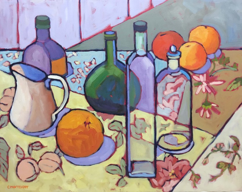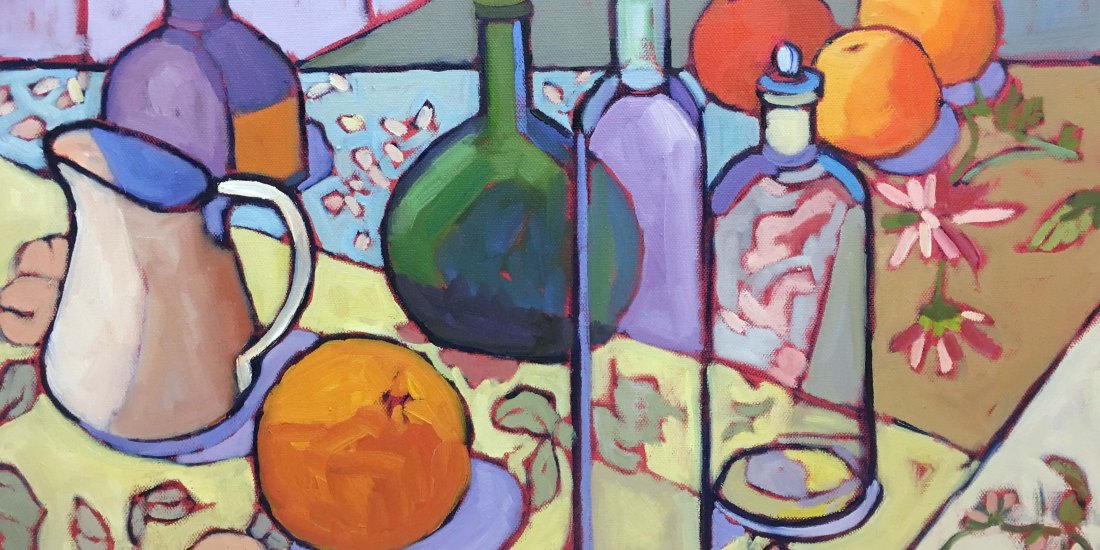 O I love the light, colours, and the “air” moving through this painting! It’s so free, and the glass is wonderful, such colour. The extra delightful touch that creates this melody is the floral fabric! Love that. The title is perfect!