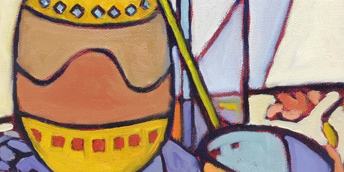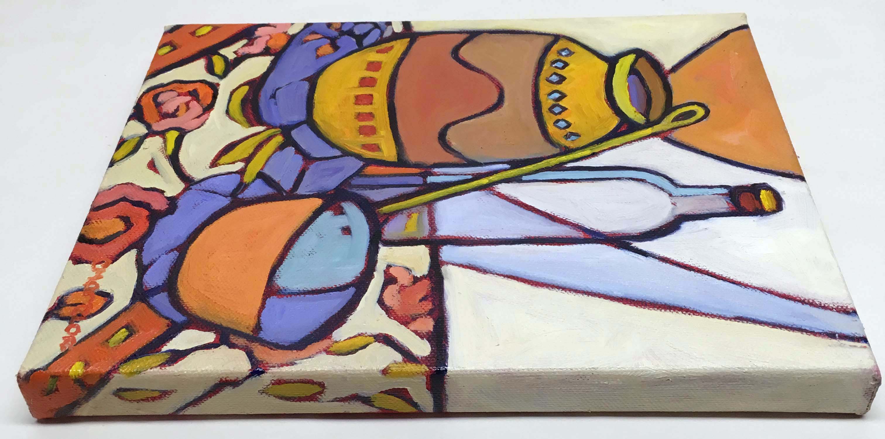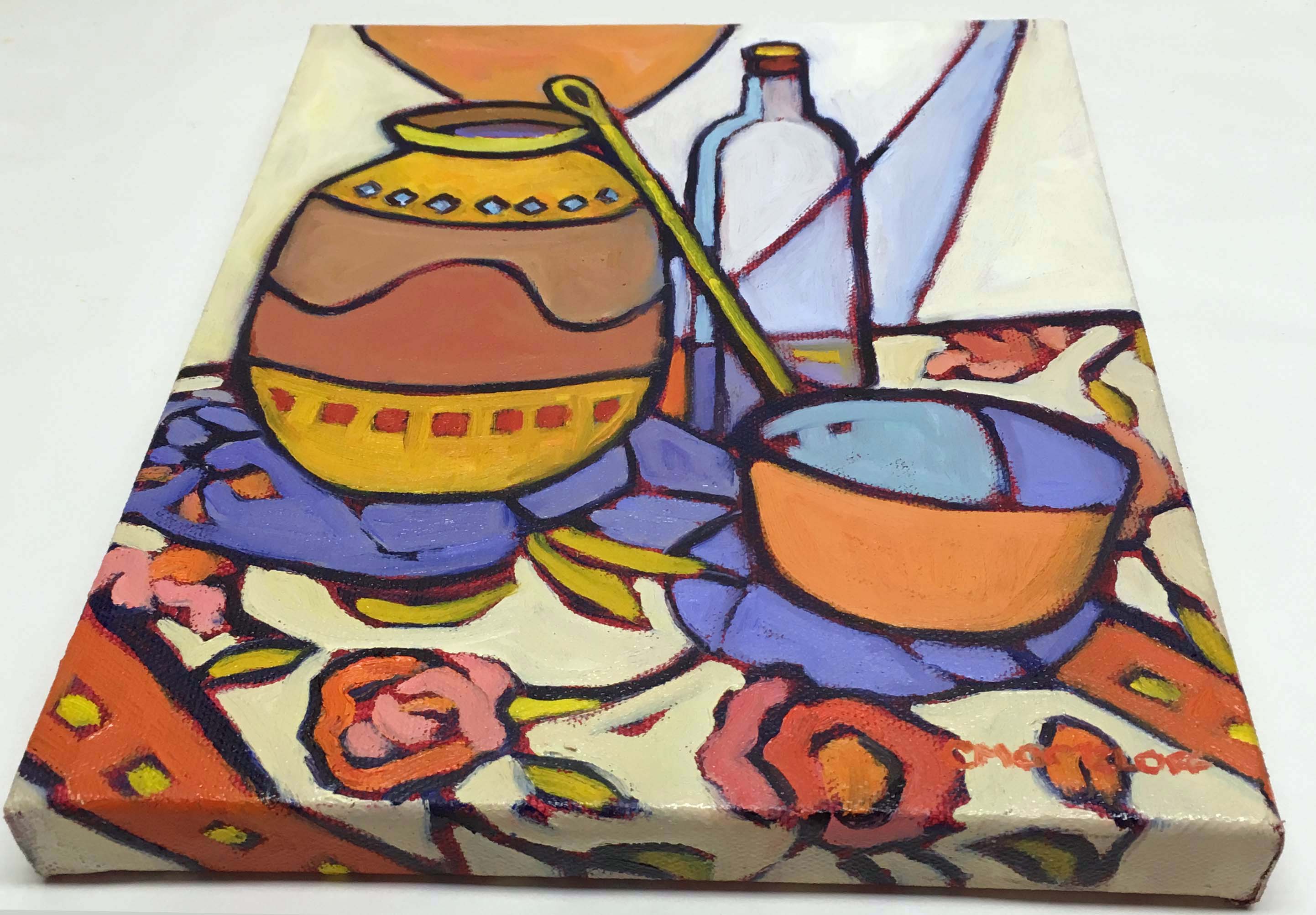 This painting emerged from simple objects gathered around me for years. There is a terracotta-inspired jar with decorative banding. I have a copper ladle I picked up long ago in Maine. There are also patterned fabrics that seem to hum with color. As I arranged them together, the story began to unfold. The jar held its quiet weight, the ladle brought a glint of memory, and the fabrics carried movement and rhythm. I added a sheer drape behind the scene to soften the space. This allowed the folds of color to echo the shapes in front.