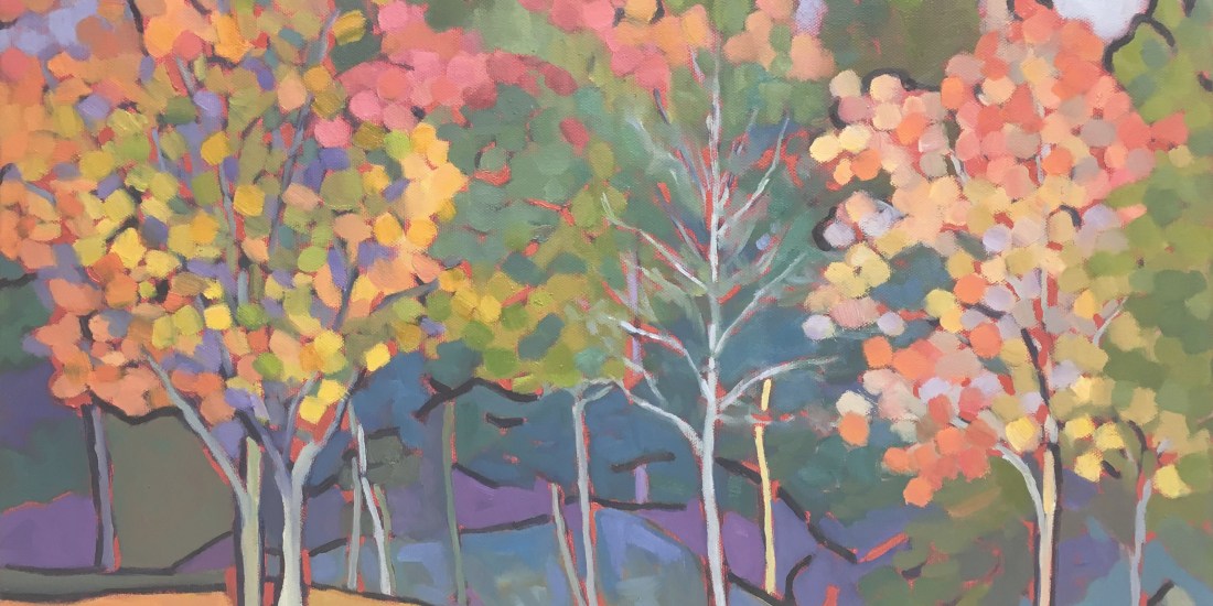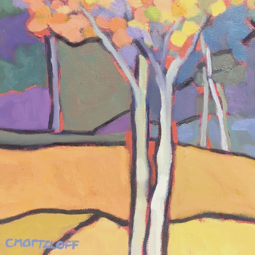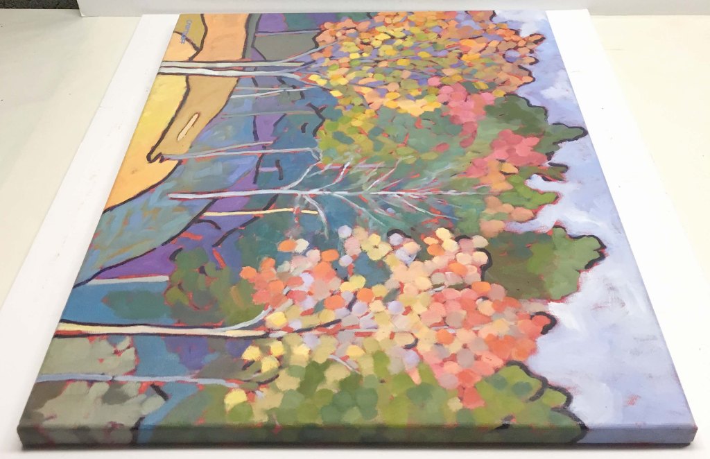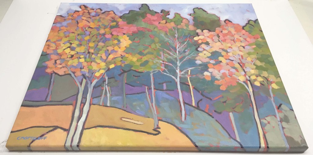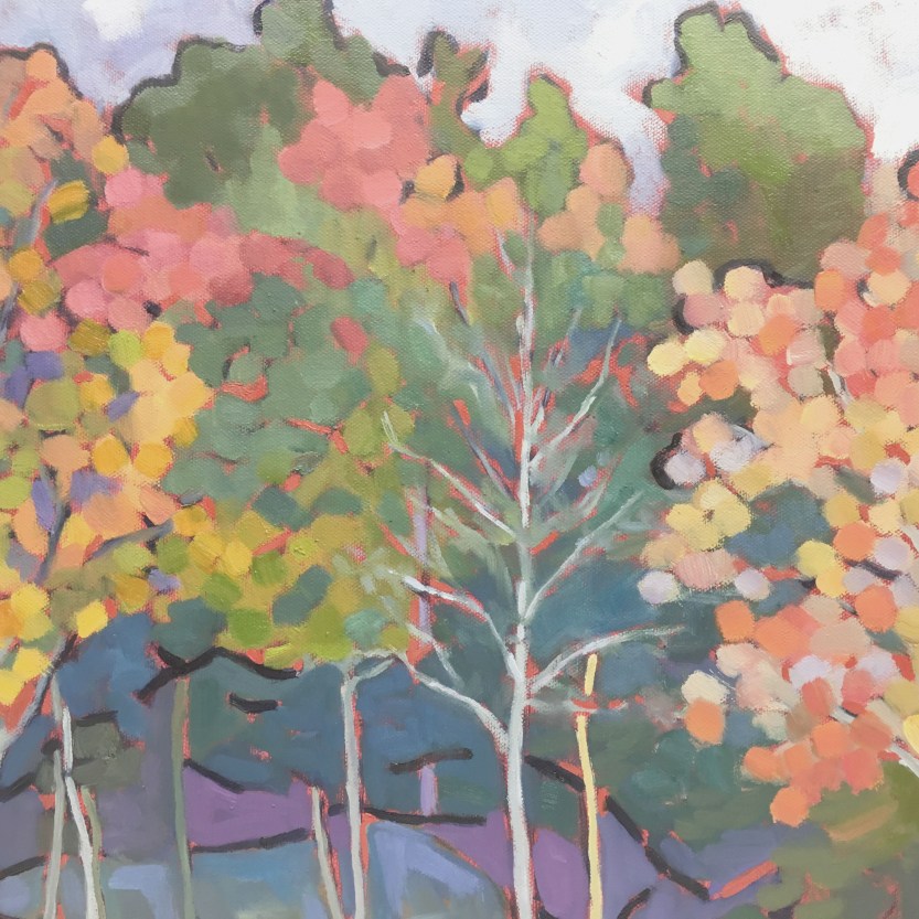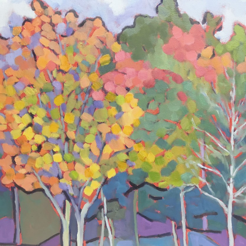 This landscape painting was inspired by a photo from a friend of mine who recently took a trip to North Carolina. When she shared some of her photos I was blown away by the intense colors and magical quality of nature. How is it that trees can change in such magnificent ways right before our eyes? I’m not speaking to the science of it but given that process the spectrum of color is unbelievable.