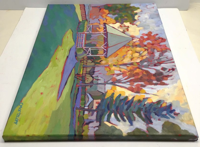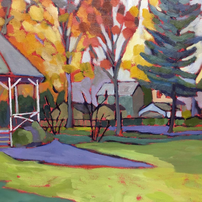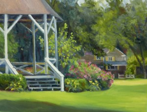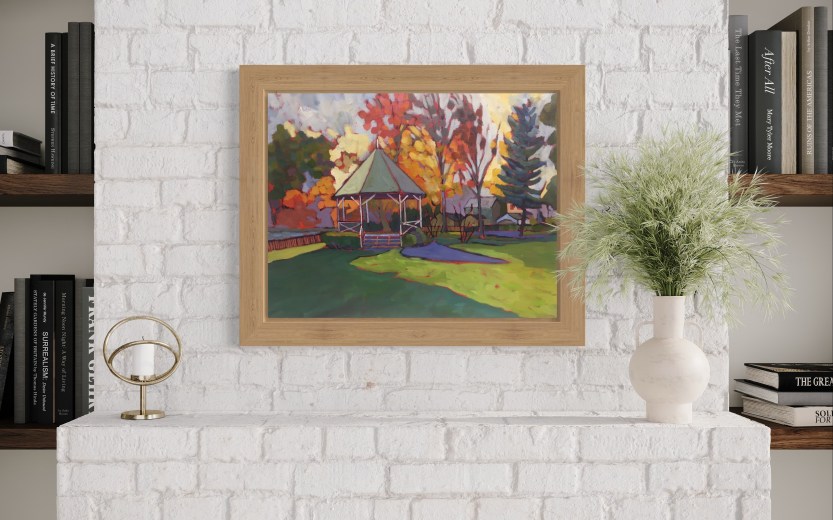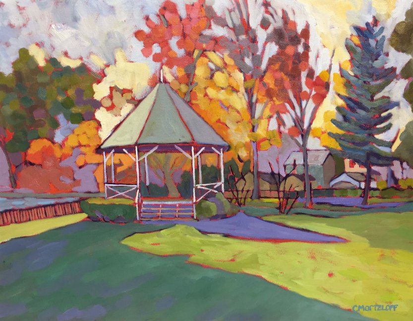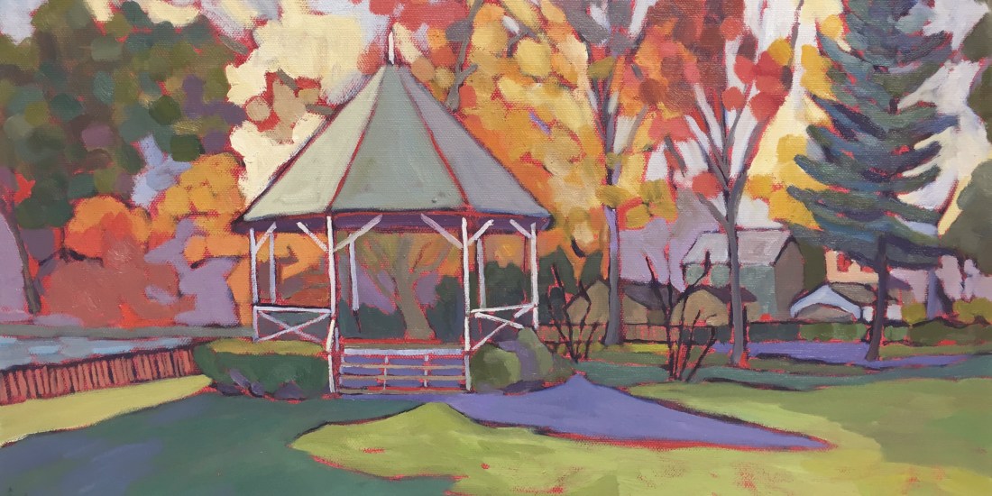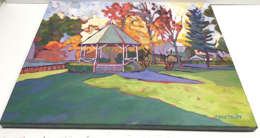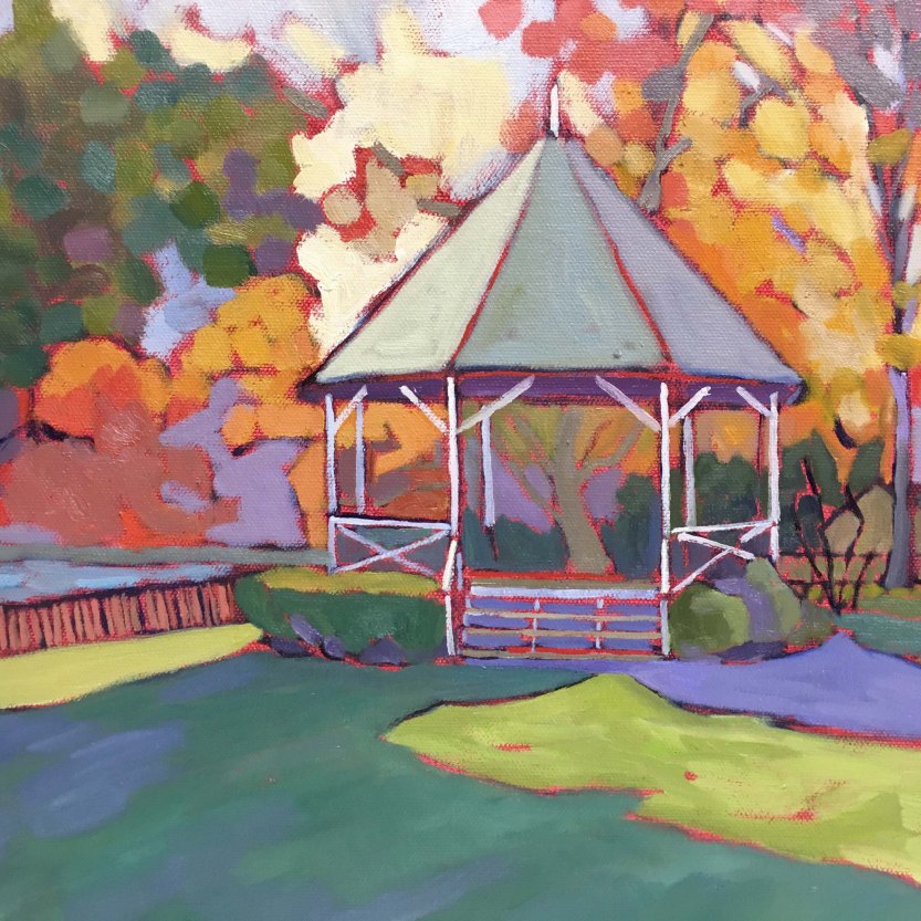 This oil painting was created from a plein-air sketch I did on a recent afternoon at a local park before all the leaves were gone. Having painted this gazebo and vista some years ago (see below) I felt called to re-visit it with the hope of catching something new. The new one was painted on a gallery wrapped canvas and is a signed original. If you have any questions on the painting please reach out – I’m happy to tell you more.