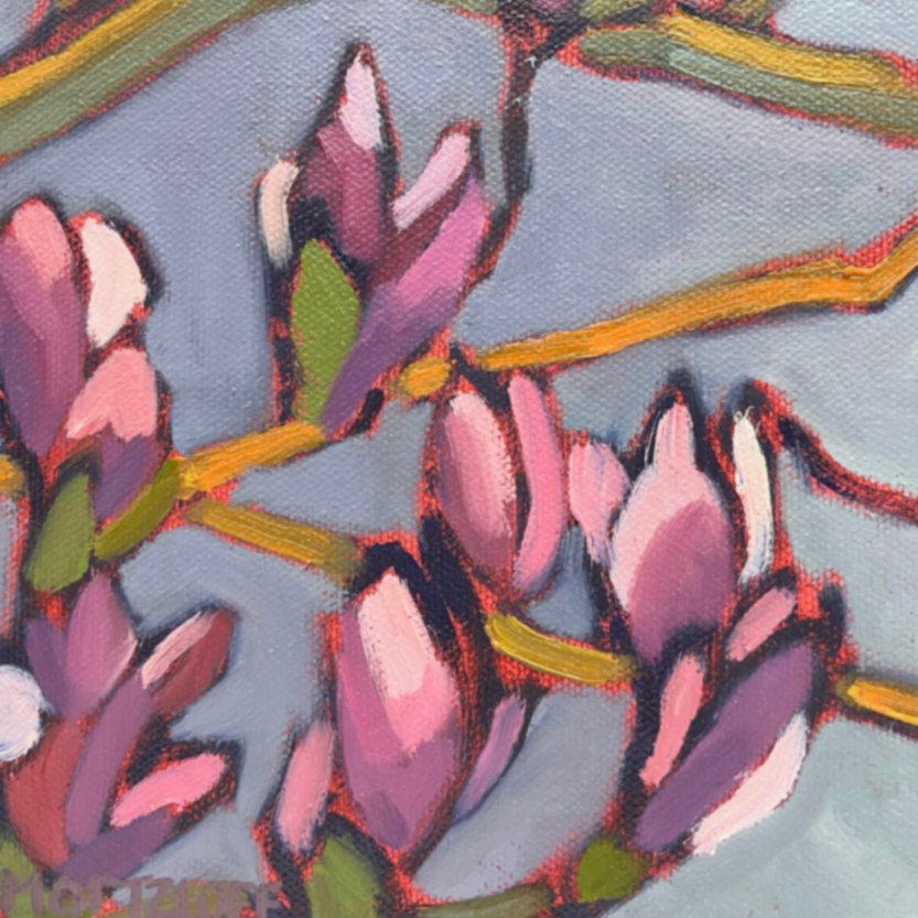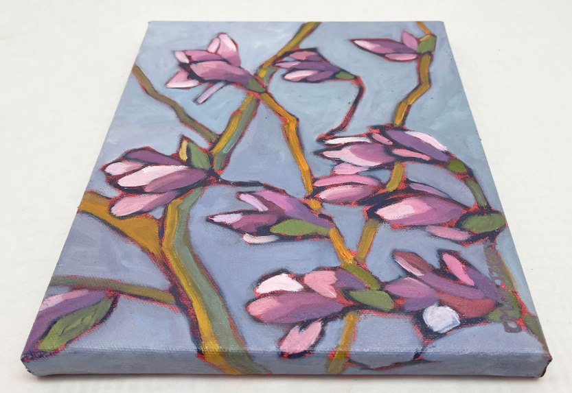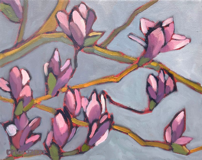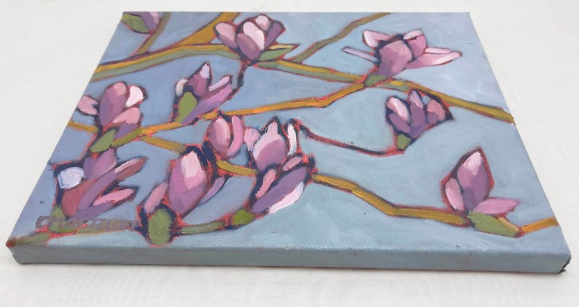 Sometimes there is no coincidence when it comes to inspiration or painting. I have this beautiful large magnolia tree in my back yard. I don’t know exactly how old it is but I’ve lived here for about 27 years and the tree was mature when I moved in. It’s an amazing tree and one I love watching come into bloom each spring. The colors and beautiful lyrical architecture of the branches enchant me.