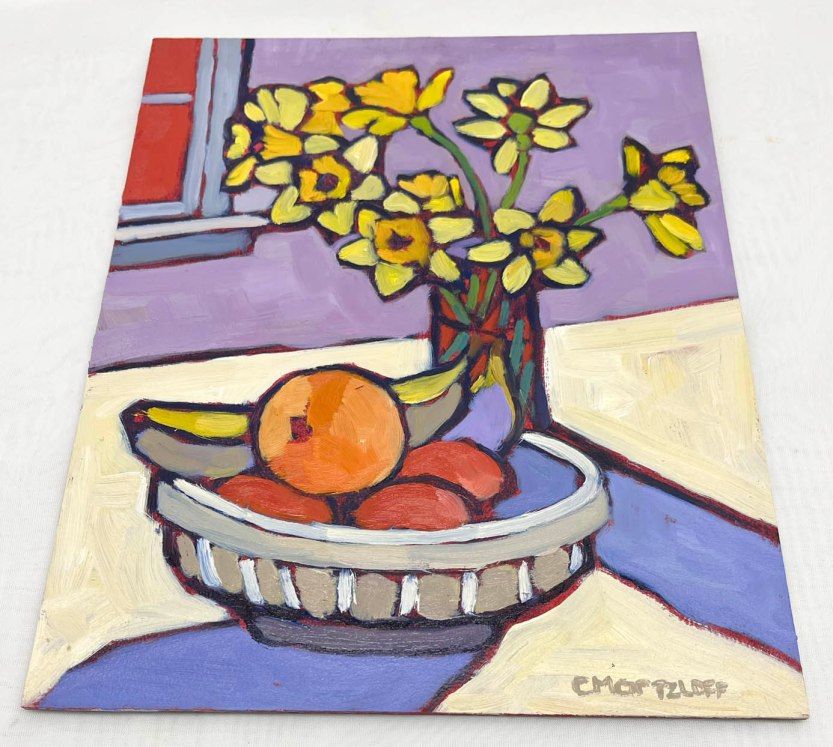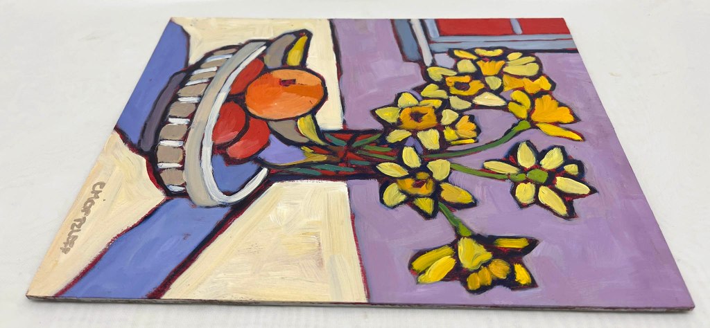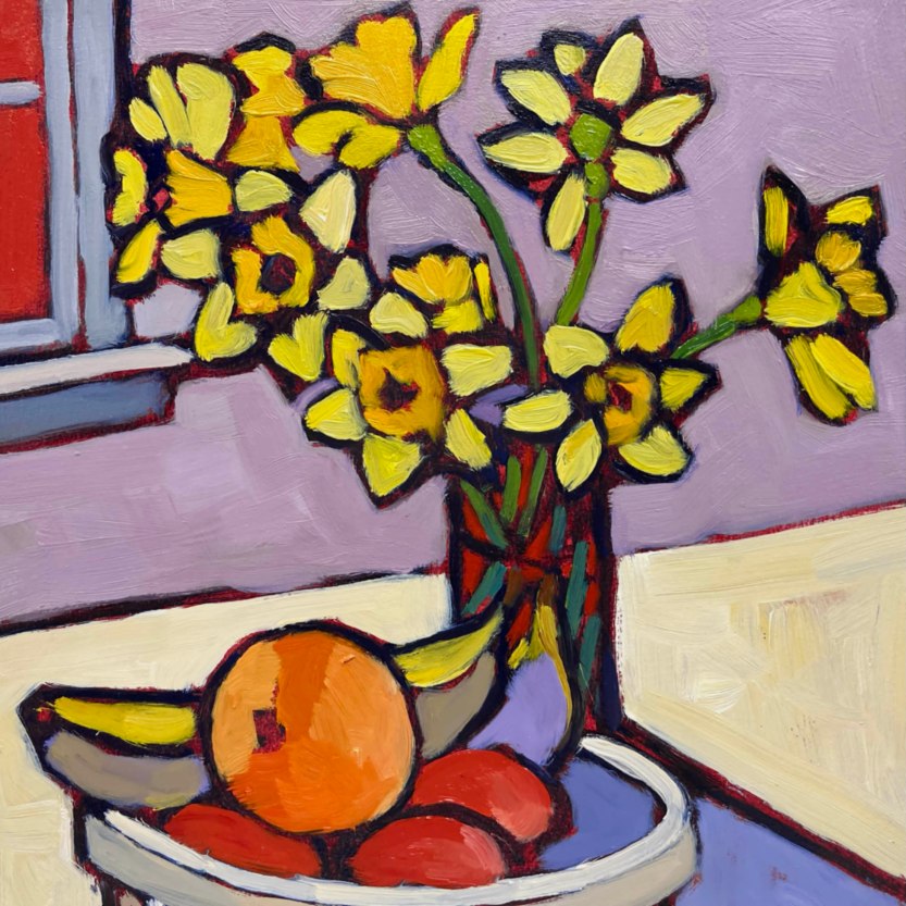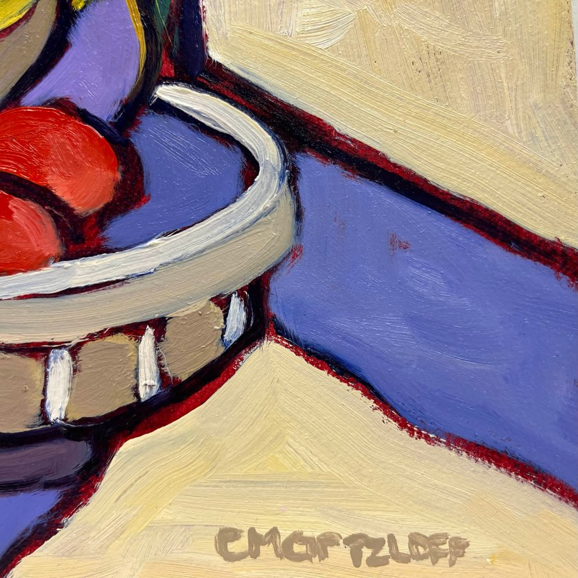 Inspiration for this piece, as I said was the yellow color and I just liked the way they were sitting on my kitchen table next to a bowl of fruit. It was one of those moments where I am passing by and the “scene” just resonates with me as a potential painting. I’ve learned to listen to those inspirations and make the time to go with it.
