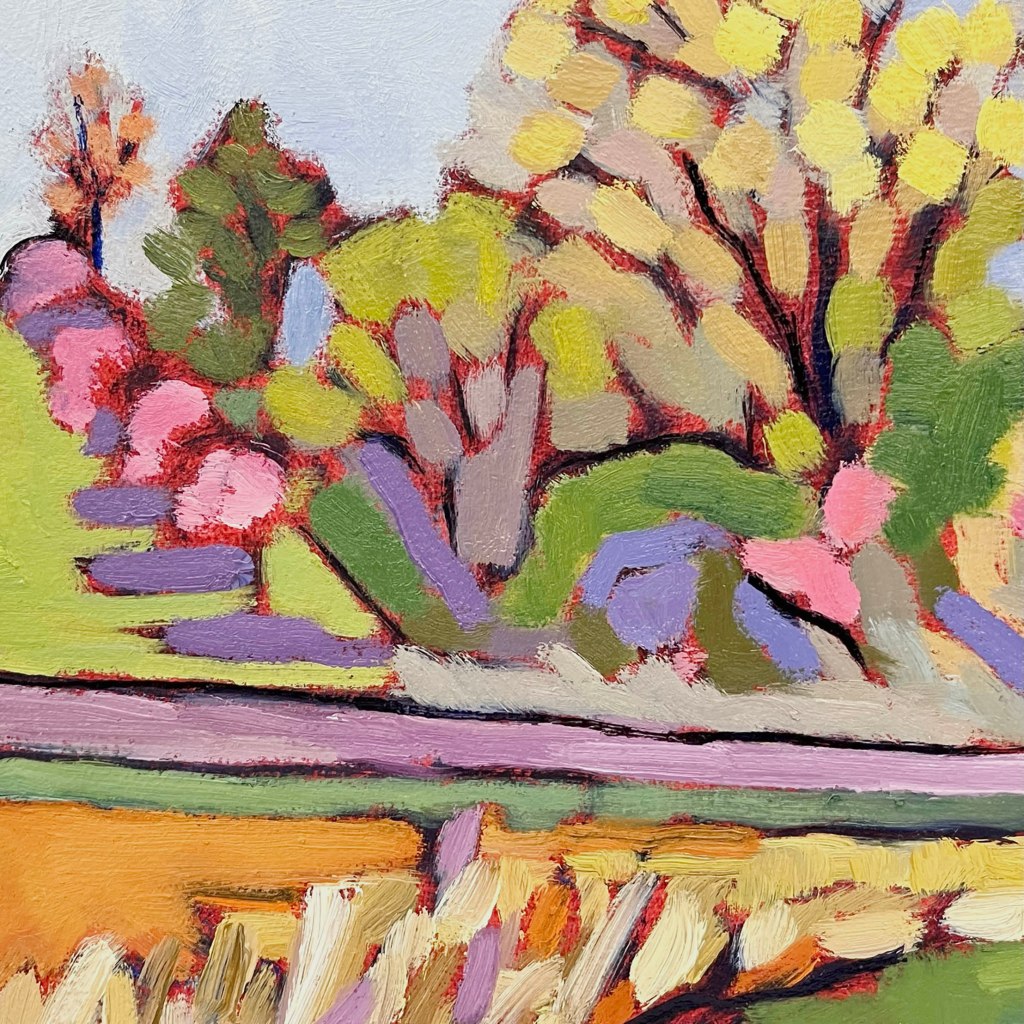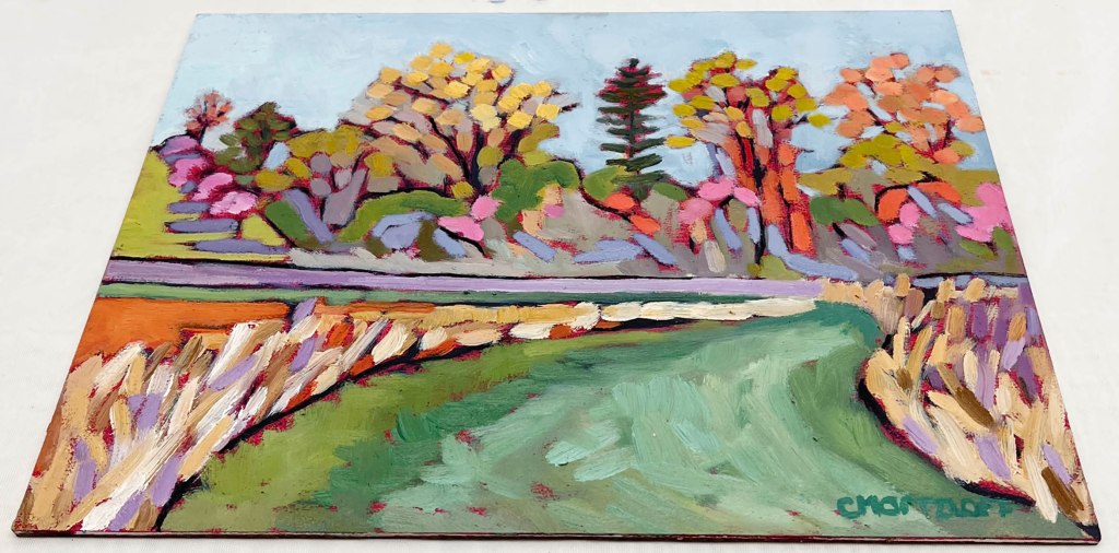 This small plein-air landscape oil painting I would describe as wildly expressive. There’s a lot of energy and movement. On some level, it was this quality that attracted me to the vista . It was an expansive location and I was able to just be there in this huge open field, alone, quiet and listening with my paints. Although the trees were not in their fullest expression, there were many hints of color to indicate what was coming. That’s what I caught notice of. Gentle passes of color were added bit by bit and slowly it came together. There would be pauses for reflection and even toward the end of the afternoon I knew it wasn’t completely done. I would need to let the painting rest, step away for a day or so and come back to see what else needed attention.