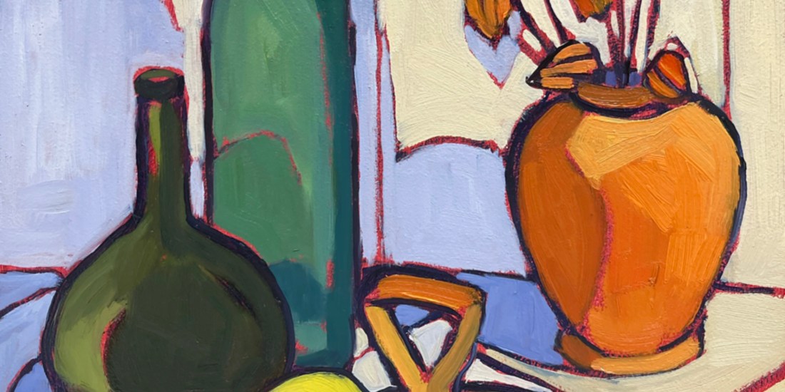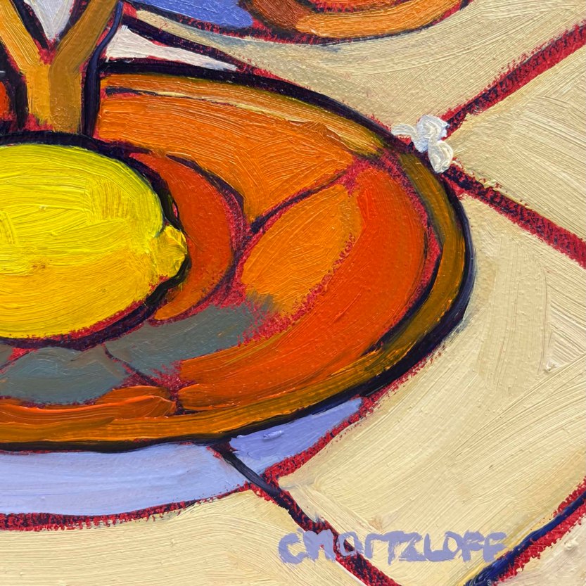 Inspiration for “Perennial Fruits” centered around a feeling of connection. The arrangement was a collaboration of items that seemed arbitrary but ended up stirring memories of experiences. The objects came from different places, some were mine, some were a friends, and on the surface, simply “things”. Yet upon engaging with the painting process, I found myself traveling through time. This is part of the wonder I find in painting and as an observer of paintings.
