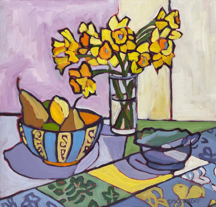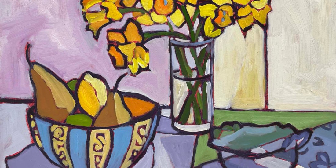 Each spring daffodils seem to make it into a painting or two. They feel traditional to me as markers of spring. I also happen to have them in my garden, which makes them an easily accessible target for a painting. I do love their bright yellow presence with touches of orange and their hardy nature. There’s not much I have to do anymore to care for them, and I relish the fact that they multiply each year!