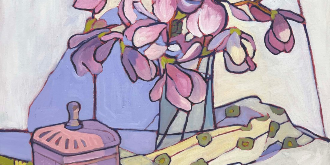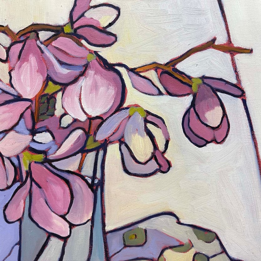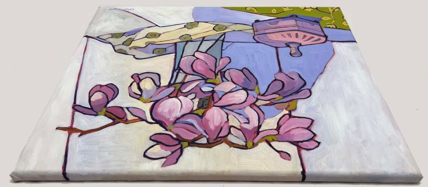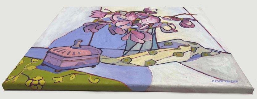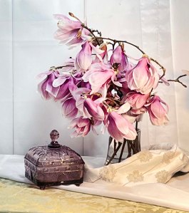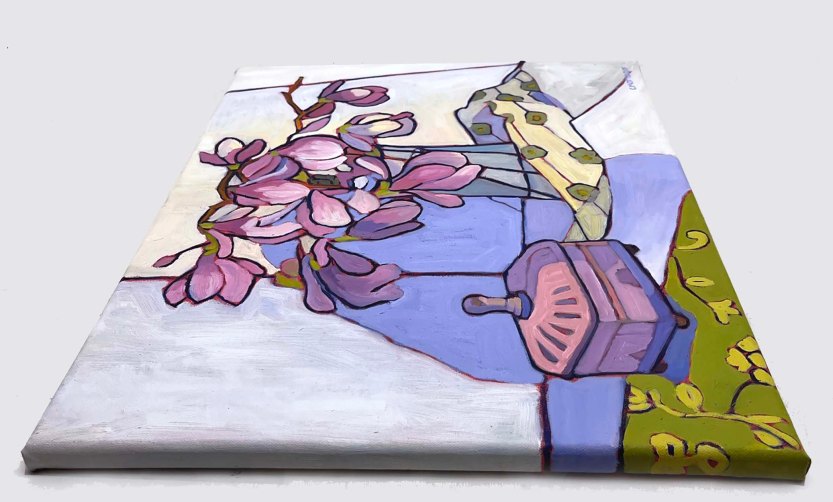 I was inspired by a friend of mine to clip some of the branches from my magnolia tree and create an interesting still life arrangement that we could both work on in my studio. This is the outcome! I loved the beautiful glass box she brought it felt like it was a piece that marked a bit of vintage history for me. It had this 1920’s vibe to it that also worked in the context of a magnolia. The tree itself is of “vintage” age in it’s 40+ years of life.