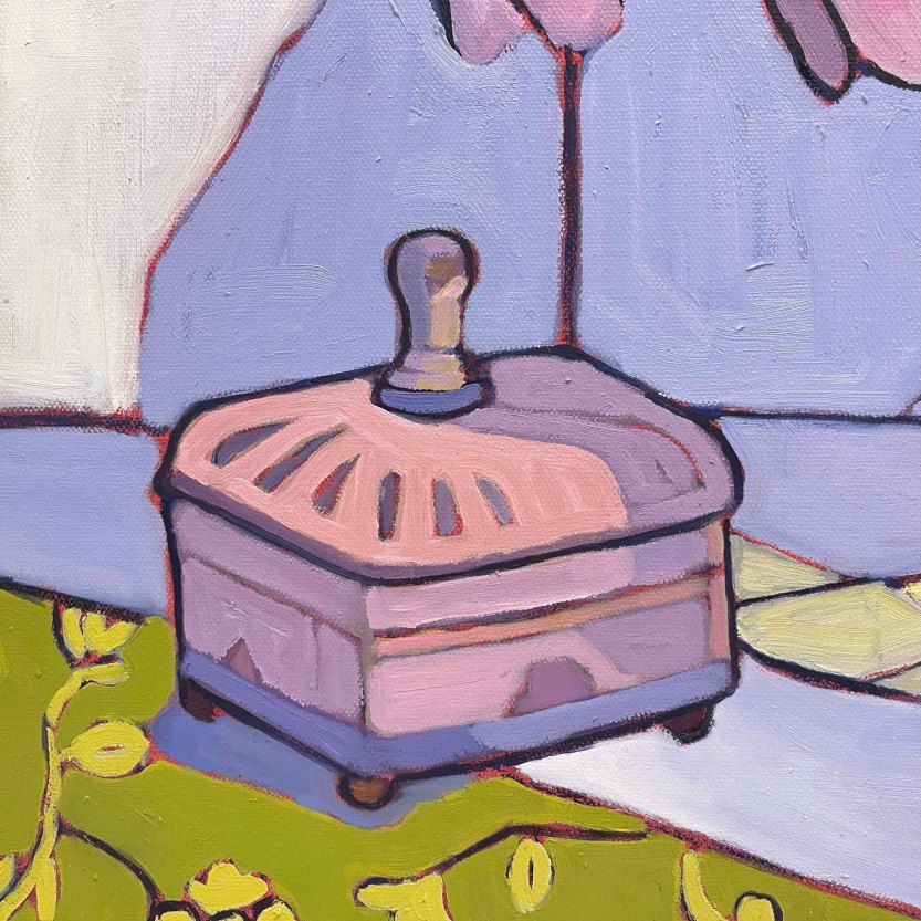 This is the general set-up we were working from. I did need to rotate out the branches for a fresh bunch as the painting progressed. I decided to alter the color on the beautiful glass box but used it’s actual coloring as a starting point to work from.