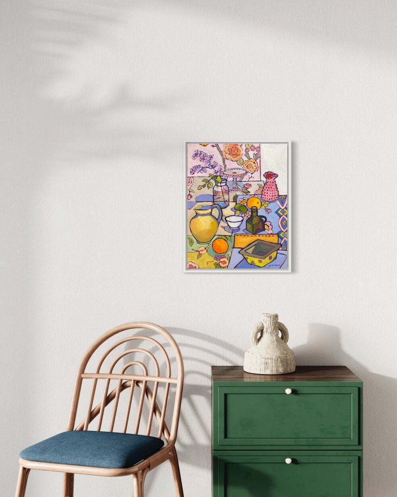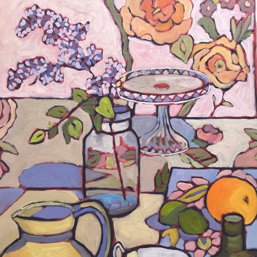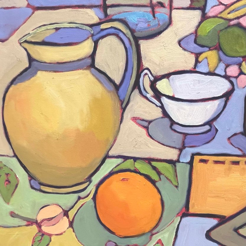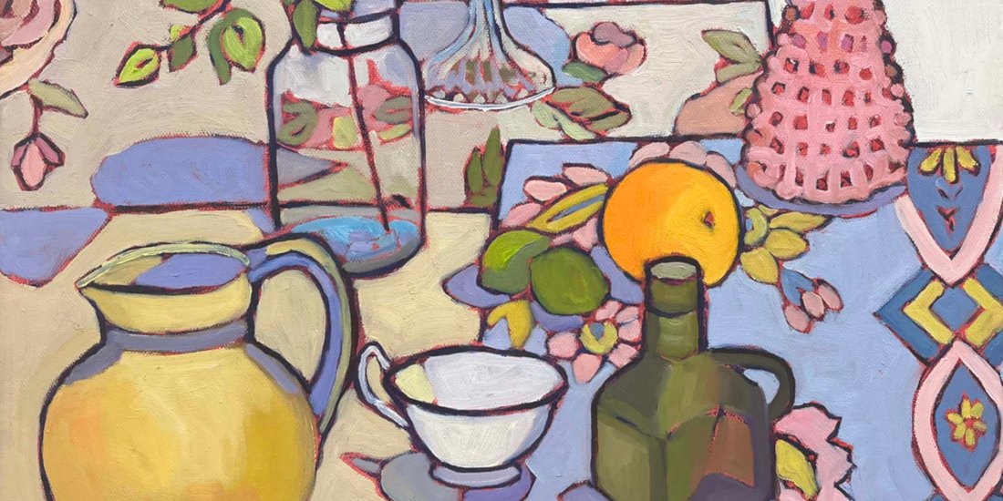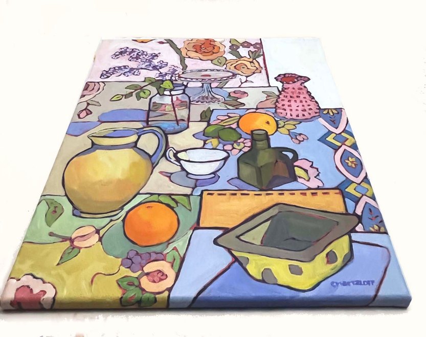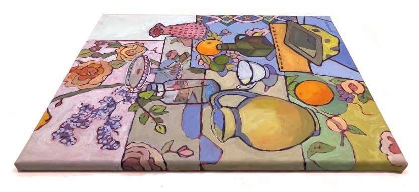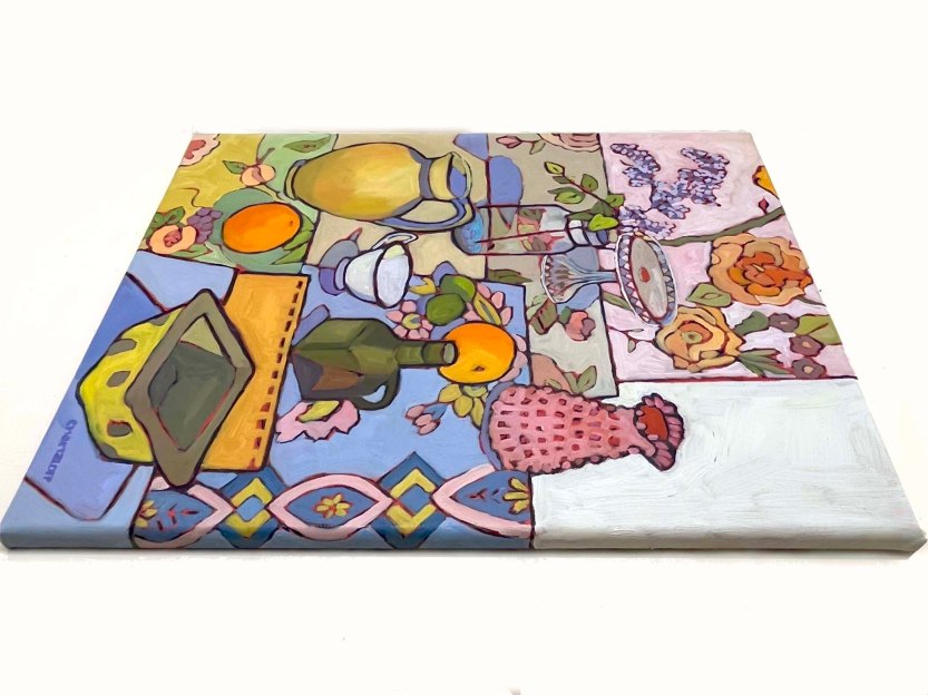 In this still life I found an identification with the idea of a quilt as an image that reflects a life journey. The patches of shapes, objects and colorways that come together in random order, like pockets of experiences, memories and vignettes I carry with me. The quilt feels like a framework of space for this unfinished story that can embrace the unexpected as it unfolds into something larger.