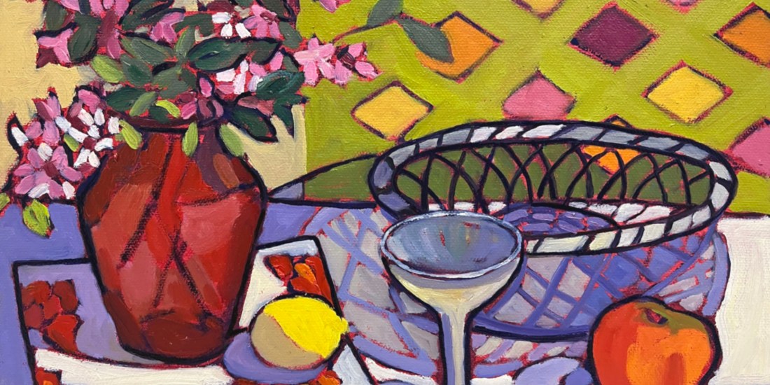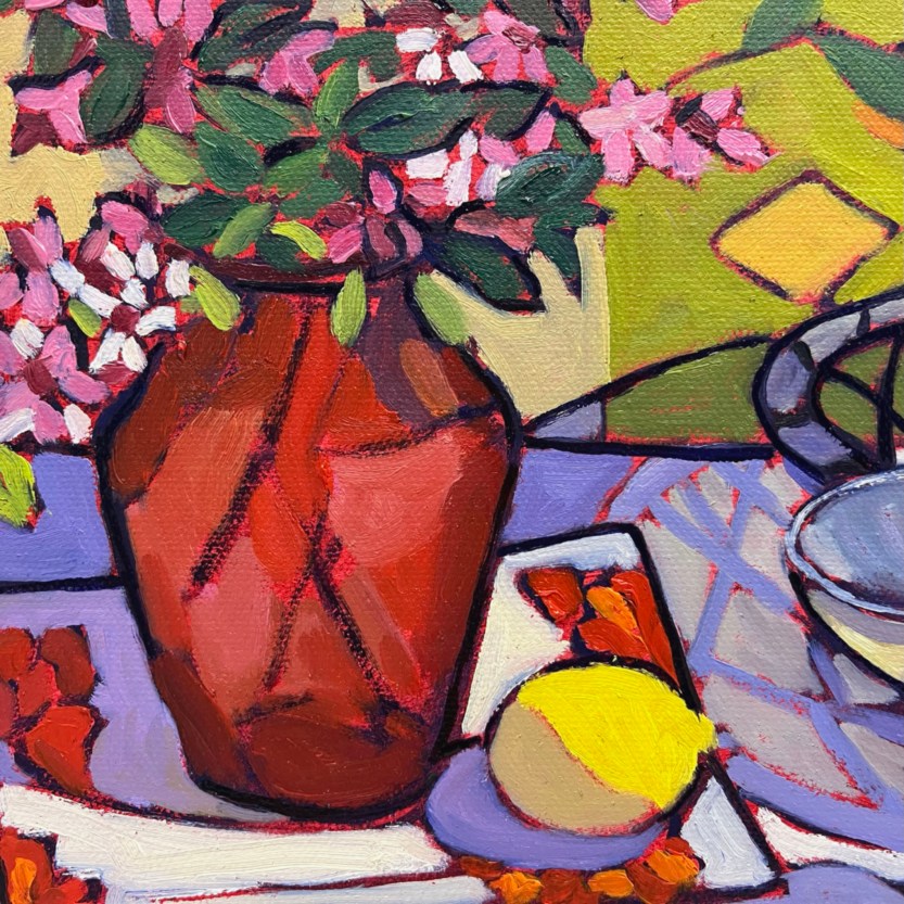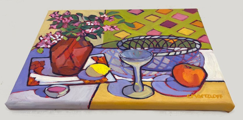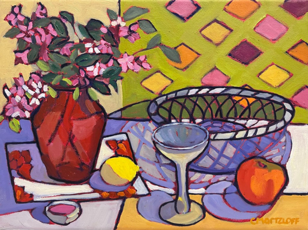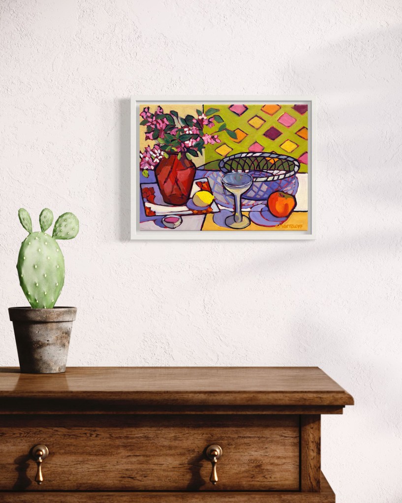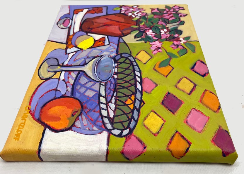 This still life rekindles that love for color and its power to transform the everyday into something extraordinary. Each object in this arrangement carries personal meaning, tied to moments and memories from my past. For the viewer, the objects might appear to come together in a random way, but for me, their connection lies in the vibrant palette and the harmony of shapes and patterns that weave them into a unified whole.