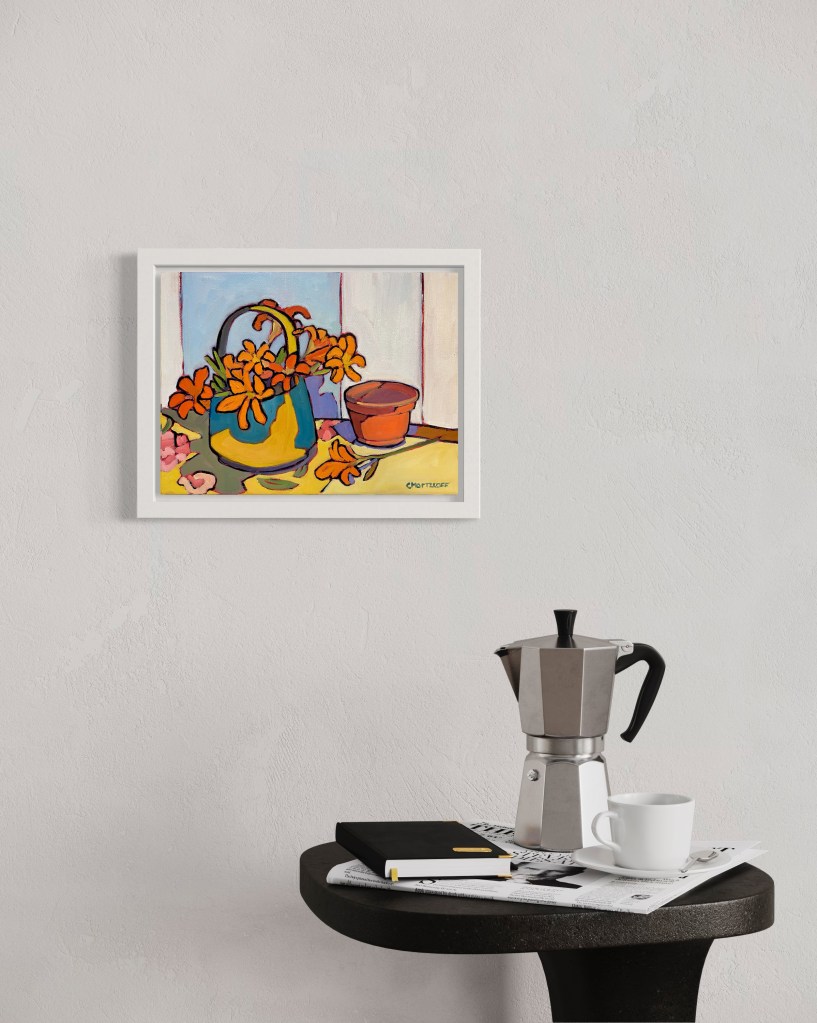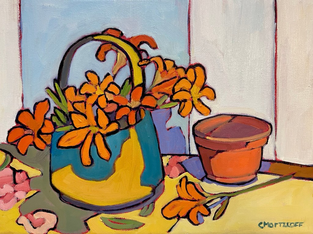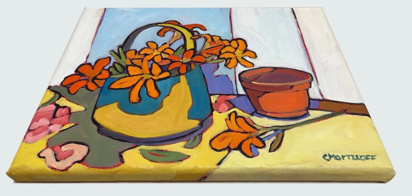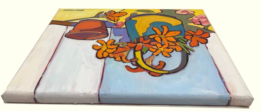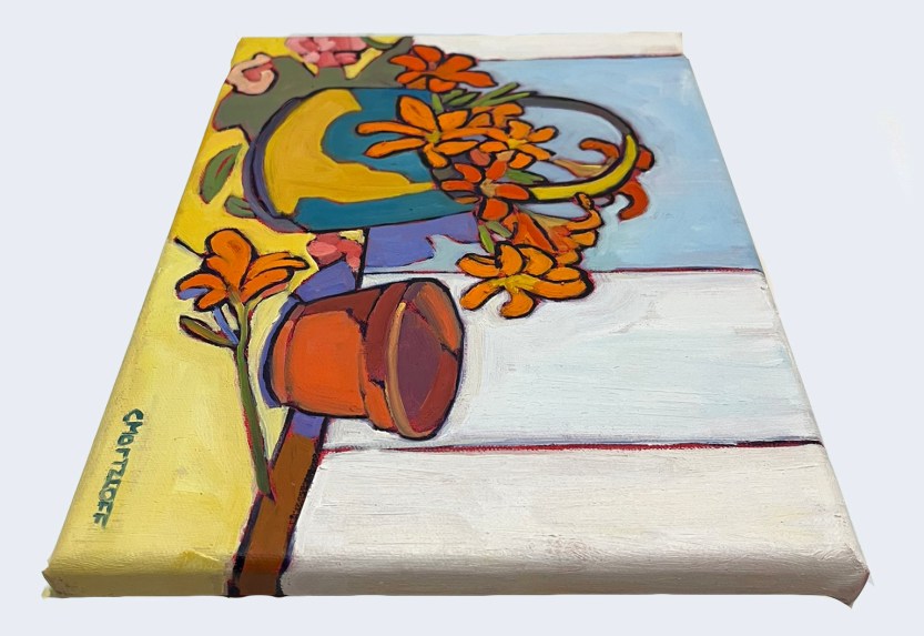 This is the last painting in a series of floral still life paintings I’ve worked on over the month or so. Each painting has a palette of energetic color. In the series I was drawn to the bright oranges and yellows that remind me of the summer sun.
