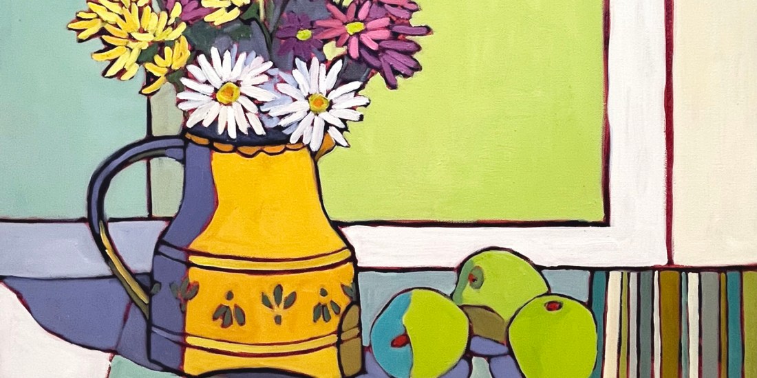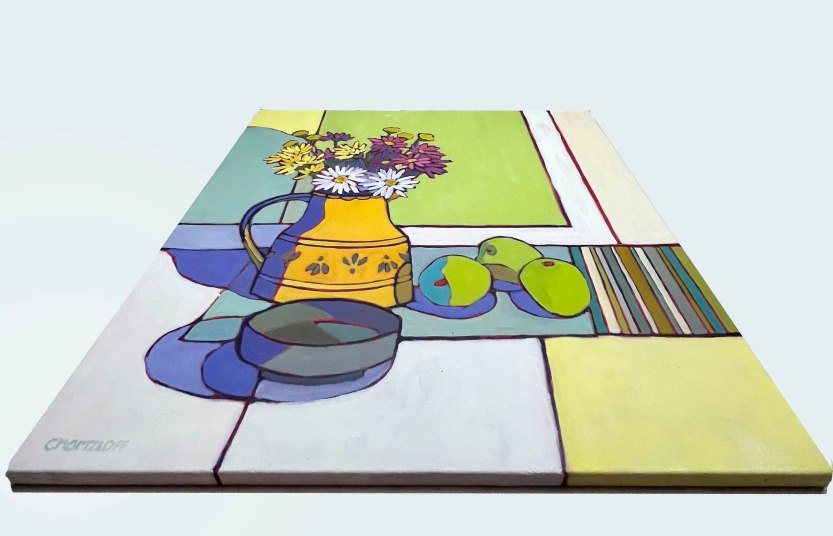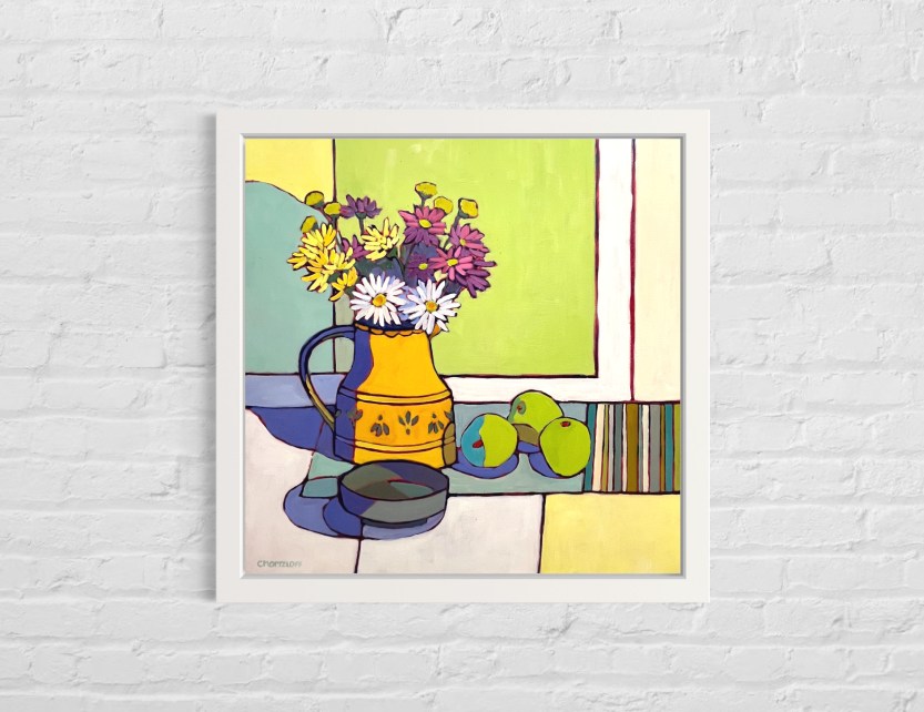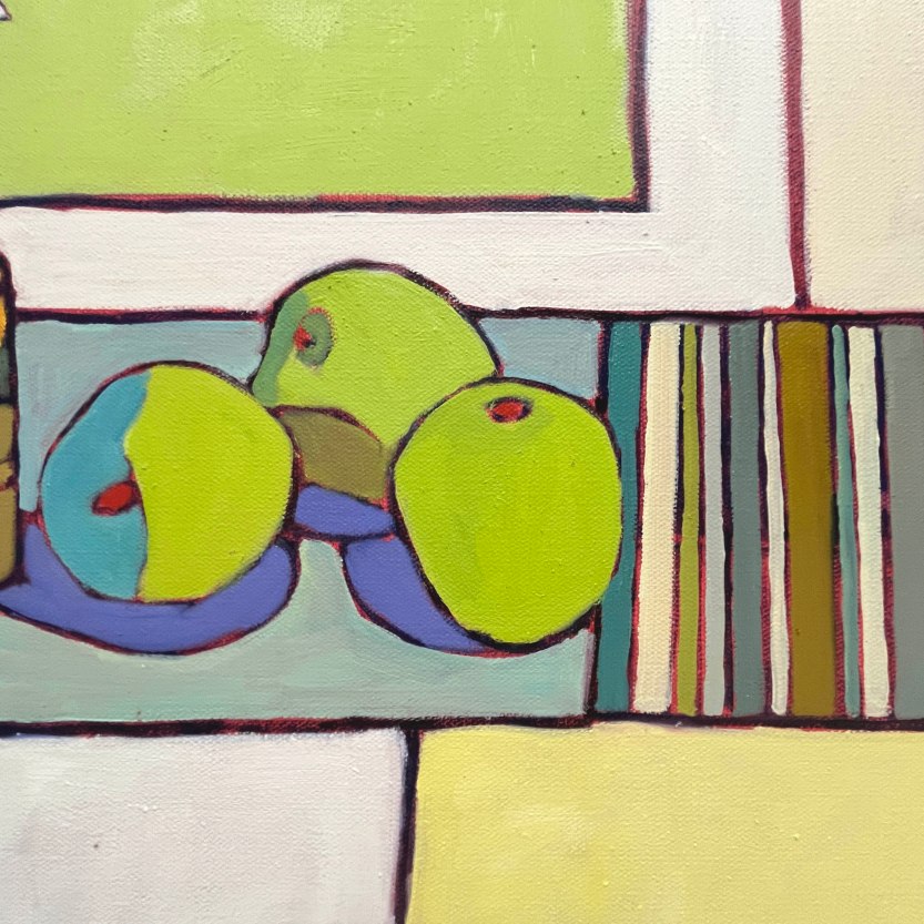 The cheerful yellows and greens in this painting add a pop of color that enlivens neutral interiors.
