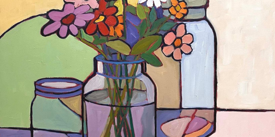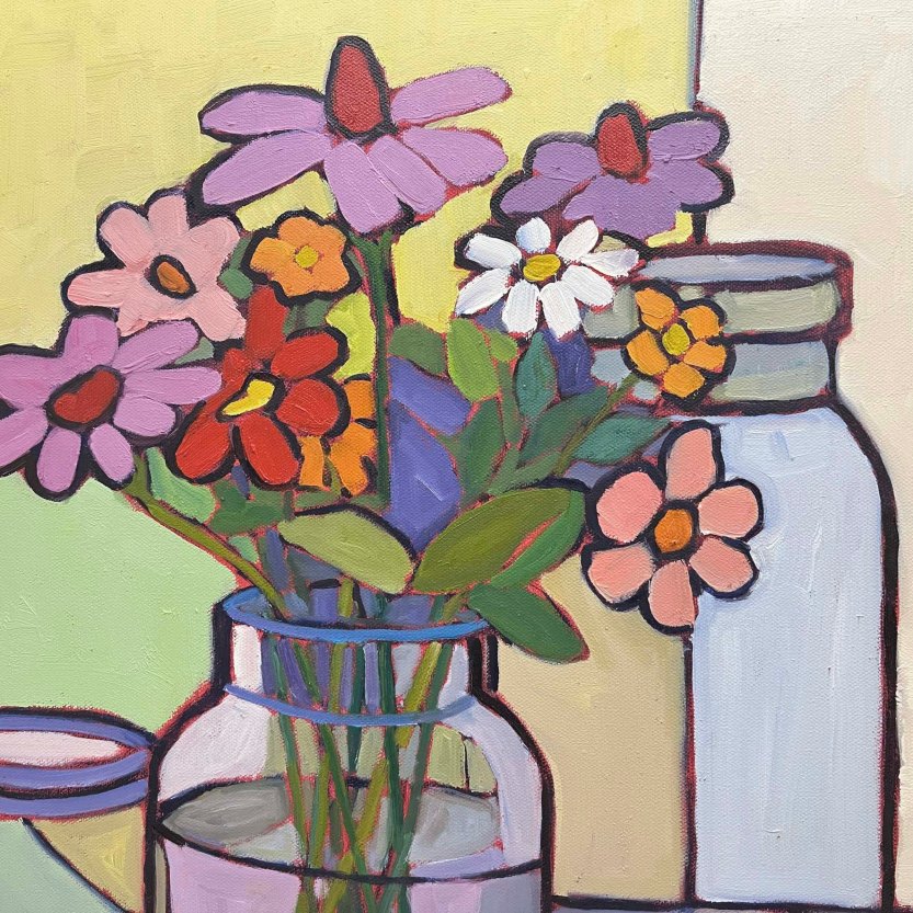 This past week I had over 30 paintings to install in a solo show that will be up through the beginning of March. My intention for the show was to showcase a body of colorful and light hearted paintings. In preparation for the show I decided to paint a couple of larger pieces and this is one of the outcomes. Inspiration for the painting came from a smaller 8″ x 10″ still life done during the summer when the zinnias were in bloom. It was their simplicity and vibrant color that attracted me in the first painting and really fit the spirit of what I was aiming toward creating in curating this show.
