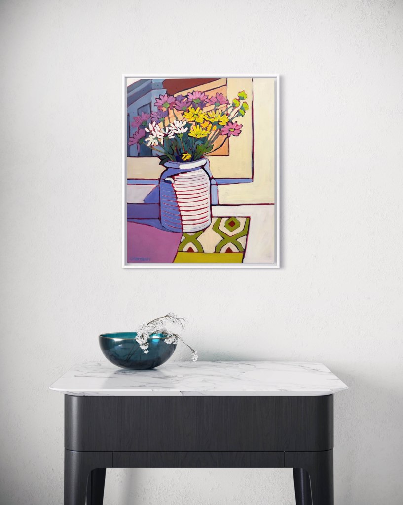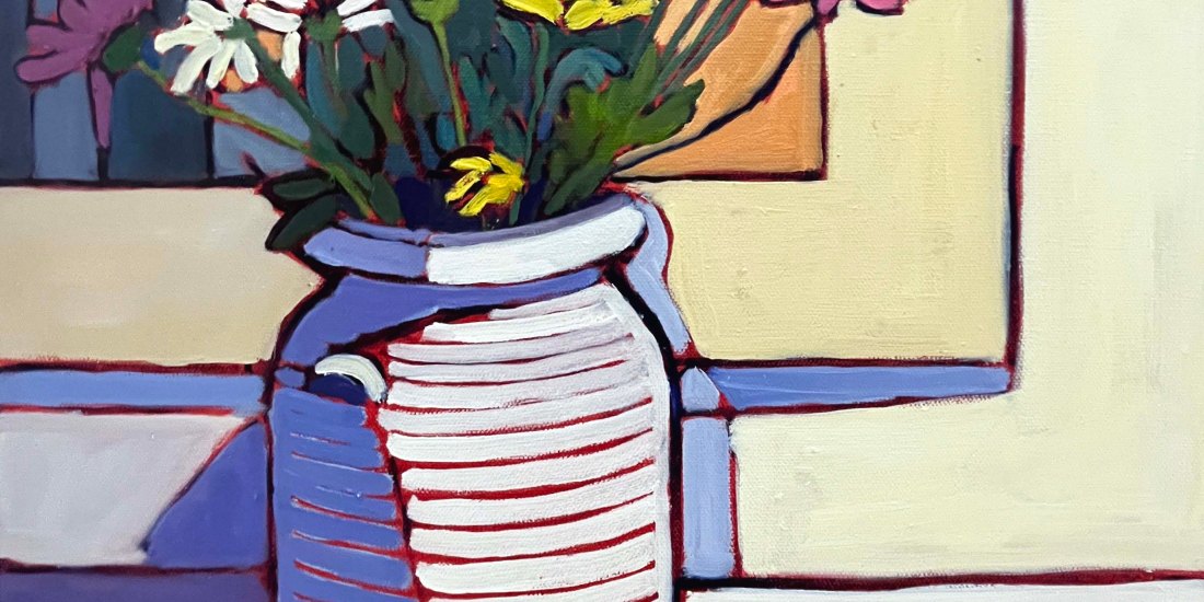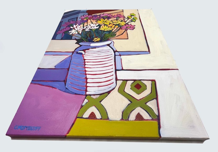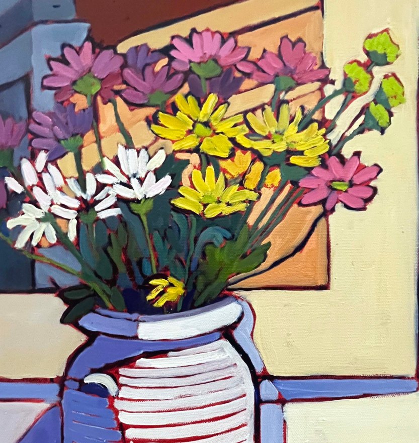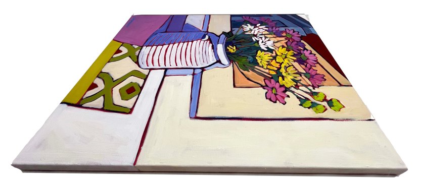 To come up with the still life arrangement I looked through the archives of artwork I have from my daughter to see if I could find something different as a background. What I ended up incorporating was a large screen print from a project she did in college. The colors resonated with those in the bouquet and I liked the graphic element of the print and its architectural design. The vase is a utensil crock borrowed from my kitchen. I enhanced it with a horizontal ribbed pattern which gives it a little “homespun” feel.