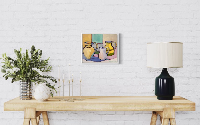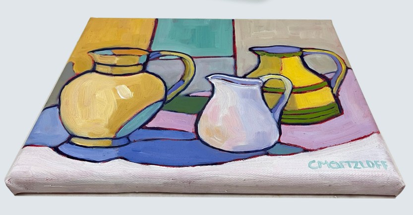 In this still life oil painting there are three types of pitchers. The one on the left reminds me of something inspired from ancient Greece. The white one is a simple, small milk pitcher made of porcelain and the one on the right is more contemporary. I’m not sure of it’s origin in terms of design but I’m certain there is an influence.