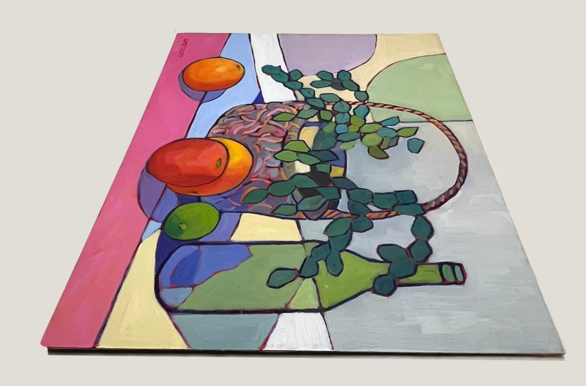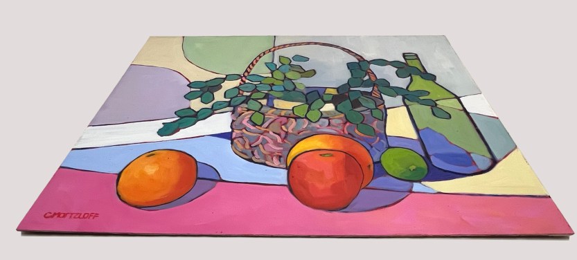 As it turned out, the painting has a personality. I think there is a lovely sense of space and whimsical feel. I was going to remove the circular motif in the background but my friend suggested not doing that. I realize the motif added something interesting to the artwork and contributed to a connection with the shapes of the fruit in a fun and unexpected way.
