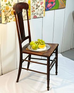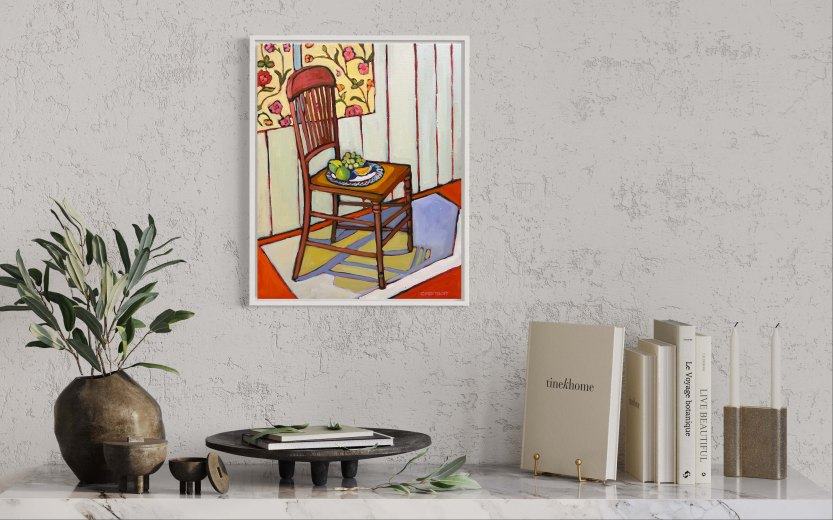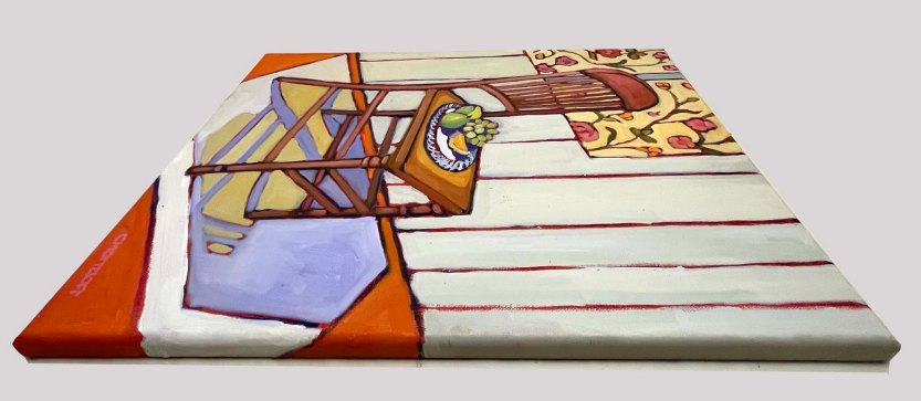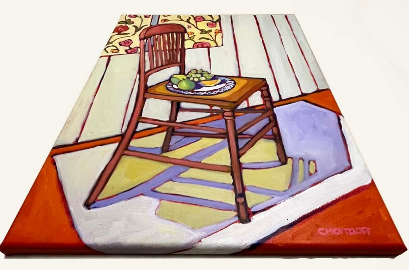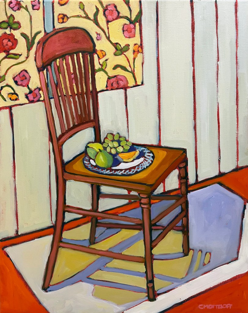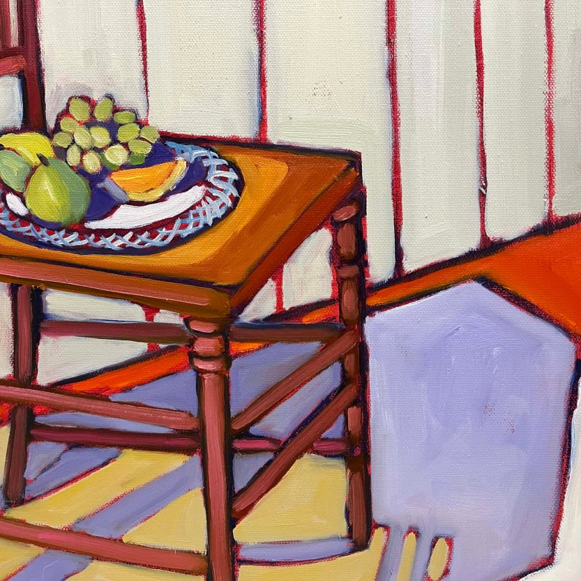 In developing this composition there was a combination of inspiration and planning. My friend suggested working with a chair and I liked the idea. This chair is of vintage nature with a cained seat that needed repair. Rather than incorporating this aspect of the chair into the painting, my friend suggested adding a plate full of fruit. I liked the unexpected nature of a plate of fruit on the seat. I had a moment of wondering why would a plate of fruit be here? I suppose that’s a launch pad for the creation of a story! Other than that I welcomed not having to tackle the caining pattern or a chair needing repair.