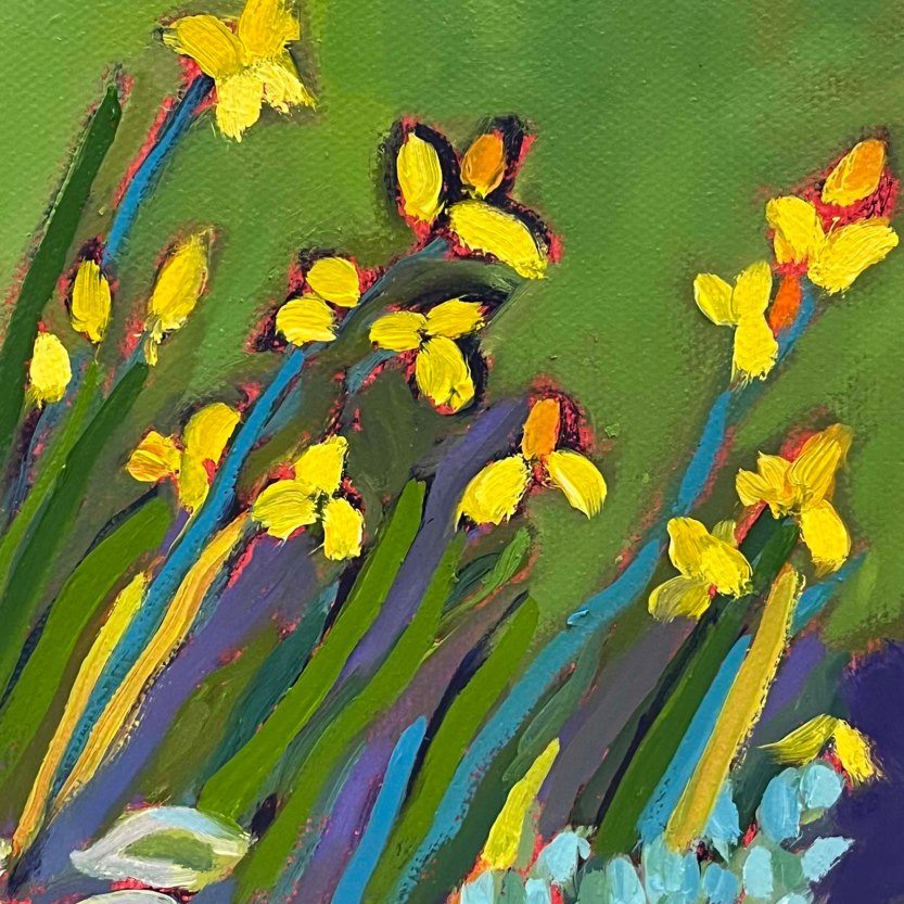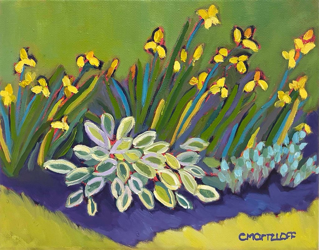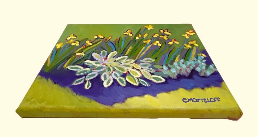 Every time I paint these I am reminded of my friend who was moving and giving away a bundh of the iris bulbs she had planted in her garden. She showed up one morning with a trunk load in her car making them available to her friends. These flowers have really added so much to my garden. When I paint them I am reminded of her generosity, the gift of friends. I have some very generous people in my life who have helped me in so many ways when life was quite challenging.