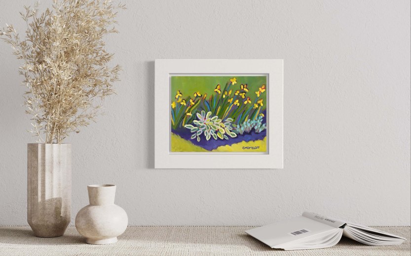 Each summer I take time to capture at least one painting of my yellow Iris. I love watching them come in and how they start with such strong flat beautiful green foliage. Mine always show up leaning toward the sun so they arc toward the right.