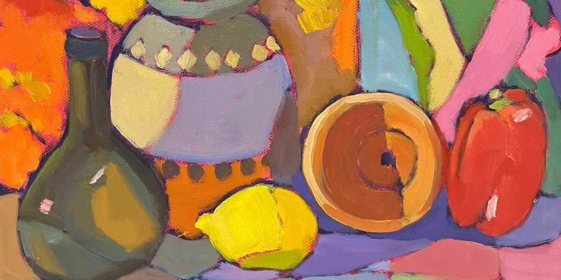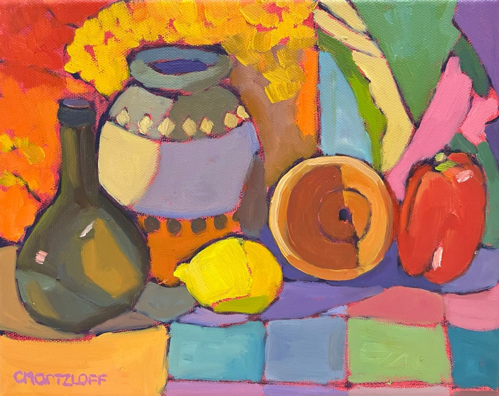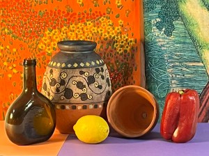 If you follow my work you will notice the same objects in my paintings. This painting is no different in that sense. The wine bottle, terracotta planter and decorative ceramic vase I’ve had for some years. They are “regulars” on my shelf of items to pull from for paintings. What’s new in this piece are the cloth and scarves that became part of the background and foreground decoration. The lemon and red pepper also show “new” and a context of time in the moment.