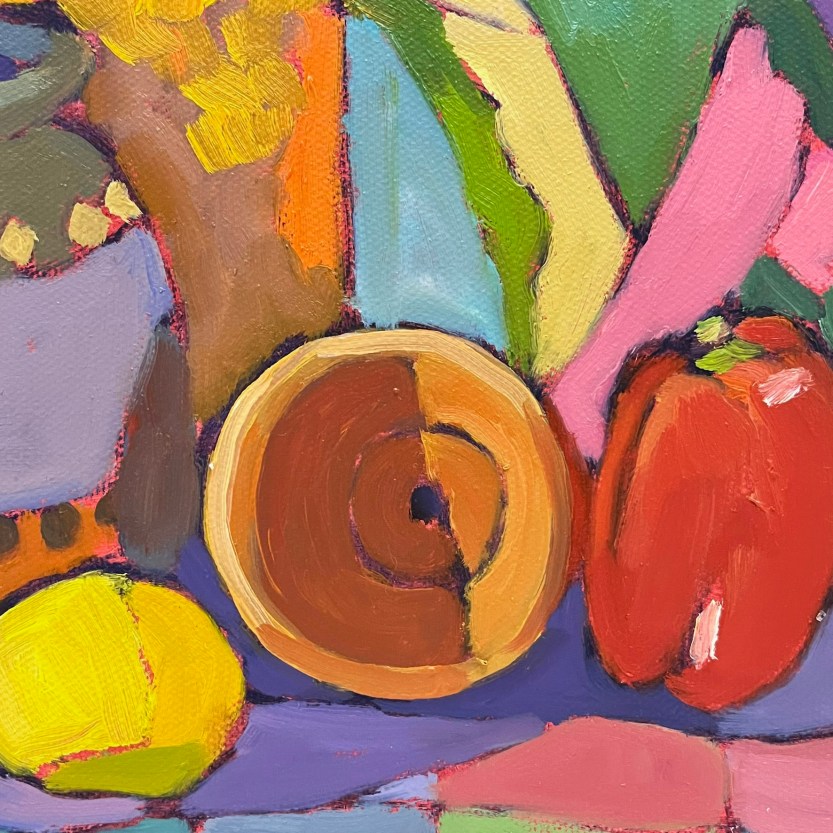 The impact of color, in my view, is endless it’s something that has a broad and rippling impact on my spirit, my environment and even my body. In this still life the inspiration was simply to create a small painting and although I love working with vibrant color I did not have a specific plan of how this would unfold. What I did know going into the painting was that I need to stay engaged with the practice of painting for it’s nurturing qualities to continue to grow in me.