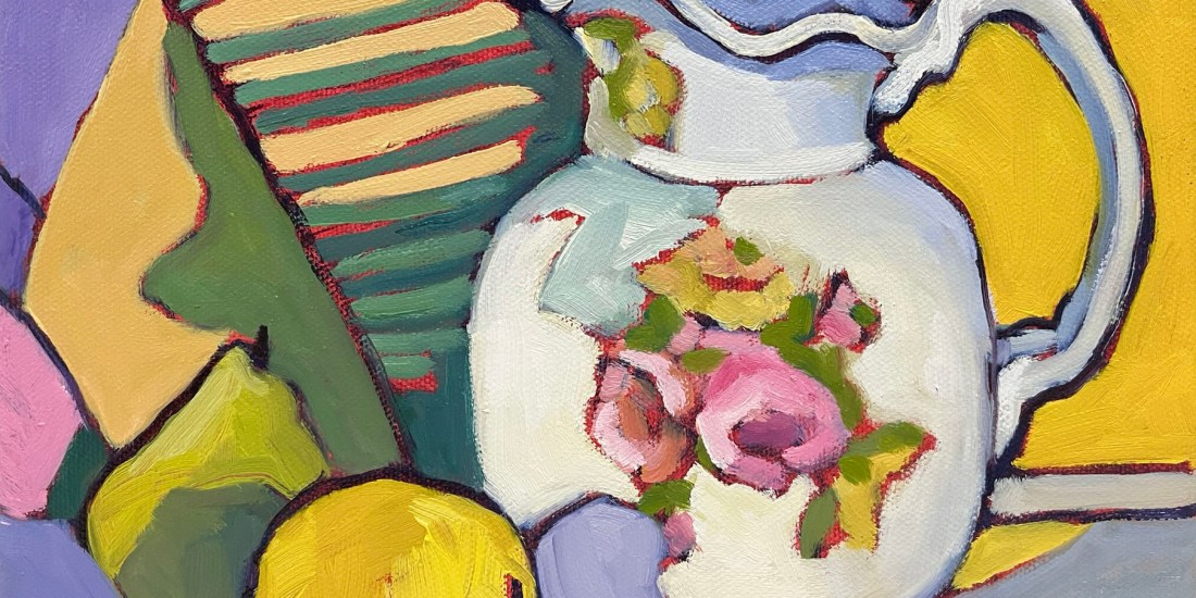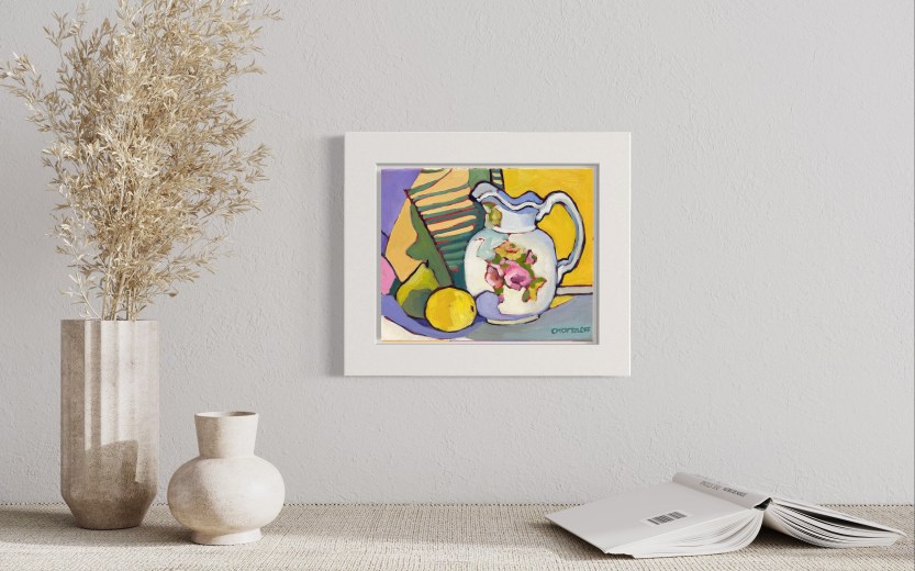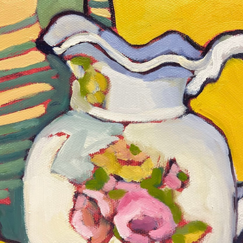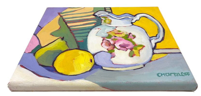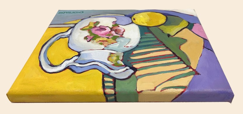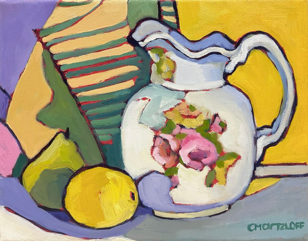 This oil painting was created in my studio incorporating a nostalgic pitcher with a pear and lemon and some printed scarves on the wall in the background. All of these items were borrowed from a friend and provided me with an opportunity to continue to explore this idea of “time” with things that have a bit of a history.