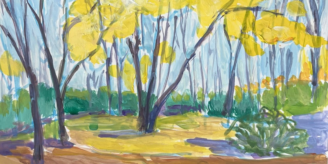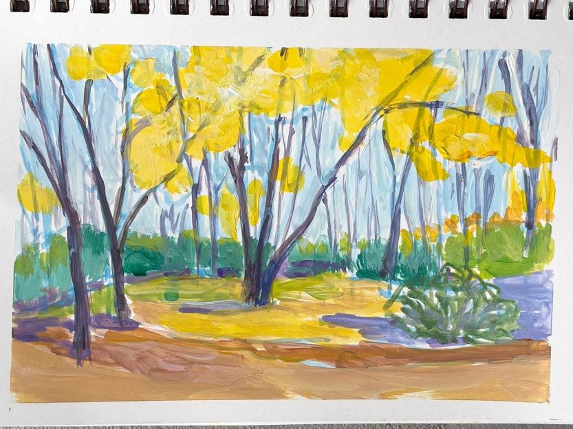 The afternoon that inspired this painting was early spring. I was taking a walk and brought my camera incase I came across something I felt moved by. It was at the end of the walk that I stopped to look back noticing this vista. The sun was starting to shift and the golden glow emerging from within this forest was breathtaking. Vibrant yellows of all kinds stood out so strong from the heart of the woods. I was taken by the contrast of the vertical timbers in the background and the pass of spring green along the horizon. I’m not sure how long I stood there observing and absorbing the moment. I didn’t want to leave but wanted to savor all the sensations being offered.