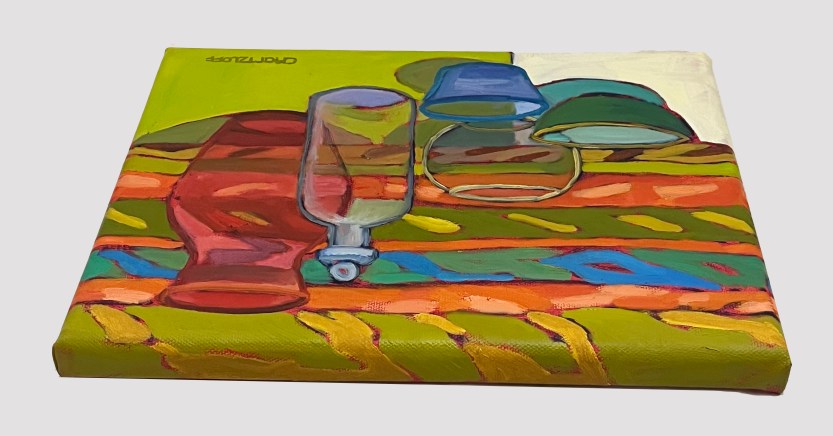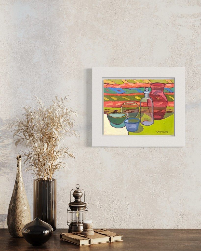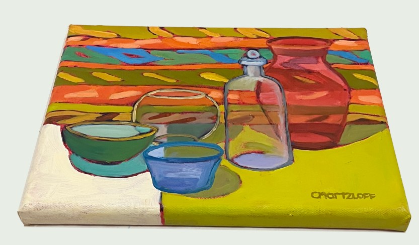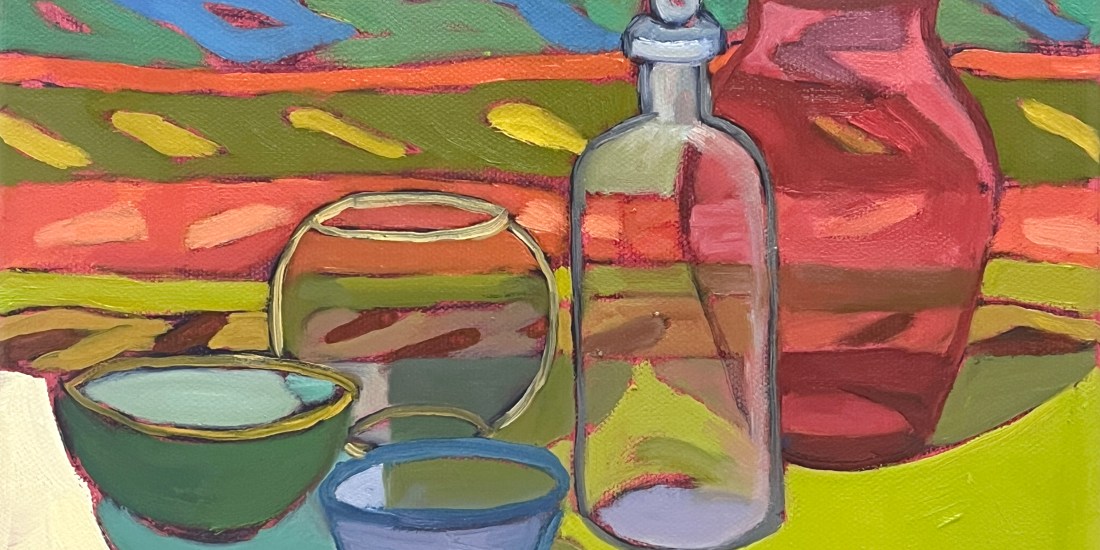 Painting often restores my memory around feelings of wonder, joy and the magic of life. Looking at artwork can illicit the same type of experience in me. When it came to creating this painting, those experiences and sensations came to life. The deep red vase, the emerald green bowl, and the cobalt blue pinch bowl became my tools for recreating this magic, each hue contributing to a vibrant, layered composition. The vintage apothecary bottle adds a sense of time and nostalgia, while a simple round glass bowl brings back memories of my daughter’s first pet, Goldie the goldfish—symbols of both history and personal moments.
