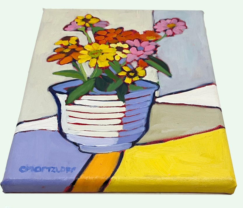Painting, for me, is a bit like planting a garden. It starts with mixing a palette of colors, then imagining the outcome on the canvas. Every stroke is like planting a seed, watching the story slowly unfold and bloom into life. This process, like the memory of those zinnias, brings me back to that inner sense of warmth and brightness.