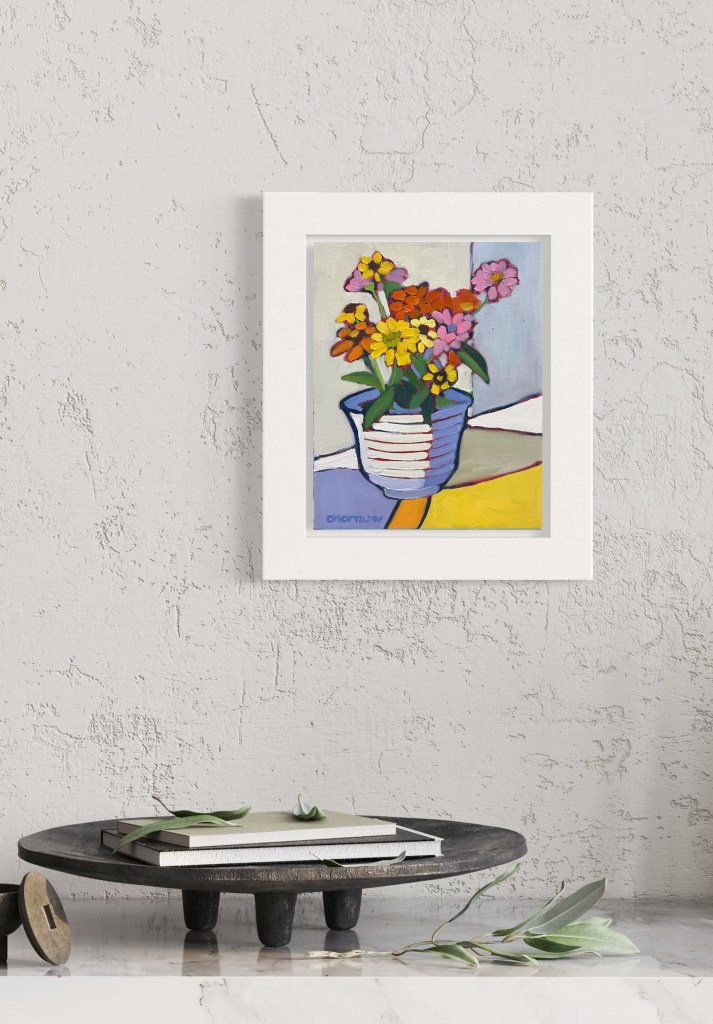 It’s Summer Inside was inspired by a desire to capture the essence of a summer bouquet as autumn settles in. Zinnias, for me, are a reminder of those sunlit days—days bursting with color and life. The warm yellows, soft pinks, and rich oranges in this piece reflect the brightness we can carry with us, even as the seasons change. With textured brushstrokes, each petal comes alive, delicate yet vibrant, a touch of summer warmth in any season.