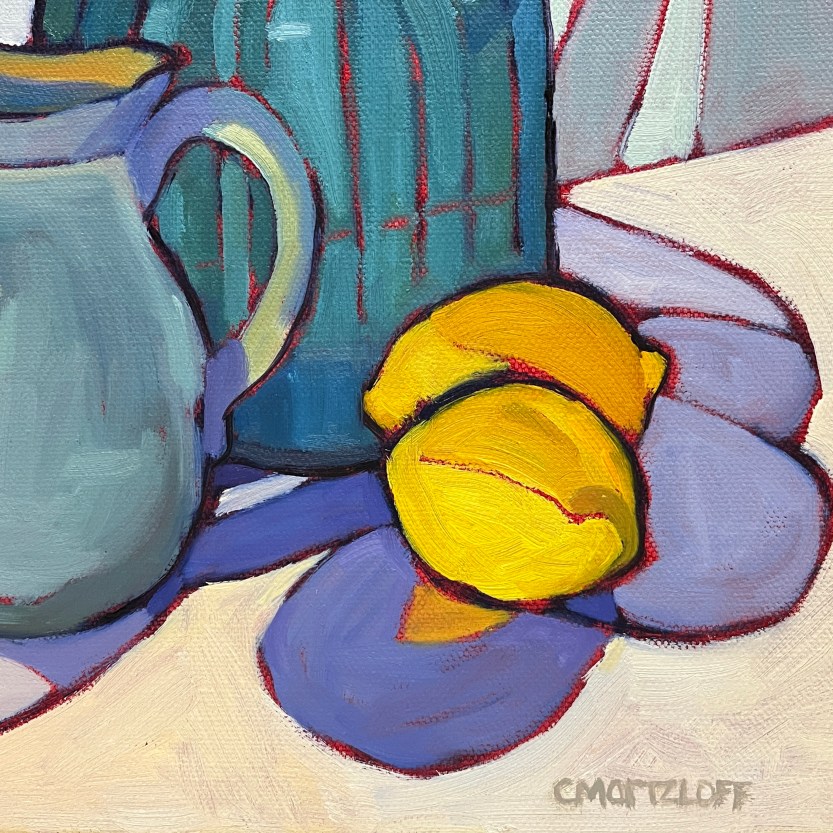 Golden Lemons and Cerulean Glass captures the beauty of collaboration and the simple joy of everyday objects. The centerpiece of this still life—a striking cerulean glass bottle and matching pitcher—was generously loaned to me by a local shop owner in my town. The moment reminded me of the power of connection within our creative communities. I originally admired these pieces as potential purchases, but when I shared that I wanted to use them in a still life, she kindly offered to let me borrow them. It was an unexpected gesture of support, a reminder that art and creativity thrive when people work together.