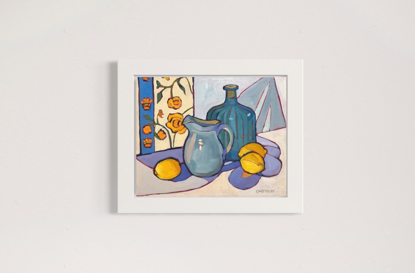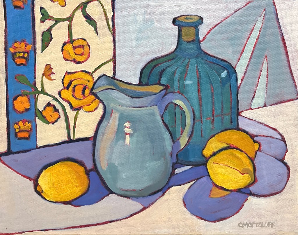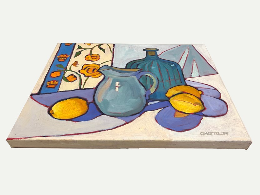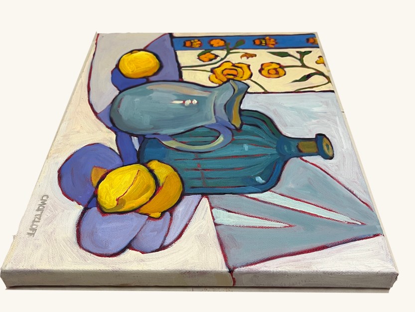 The vibrant fabric swatch I selected for the backdrop features a playful floral design in shades that echo the yellows of the lemons. It reminded me of a cool summer day while tying the composition together with harmony and warmth. Lemons often make their way into my work because they bring a sense of freshness and vitality to the scene, their golden hues balancing beautifully with the cool tones of the cerulean glass. This painting is not just a celebration of color and form but also a reflection of gratitude for the generosity and kindness that often shape the creative process.