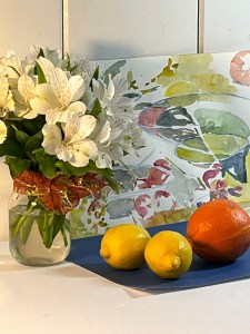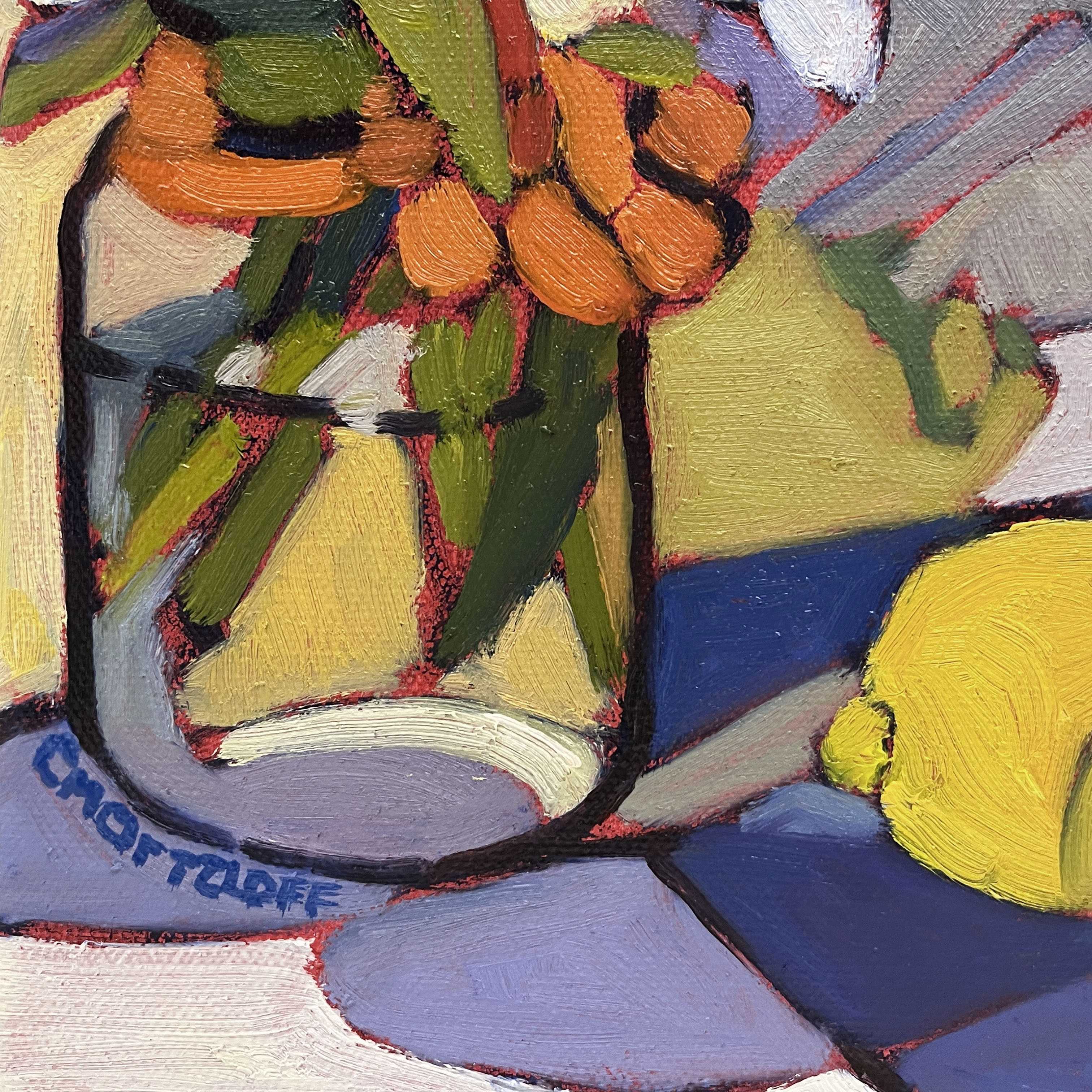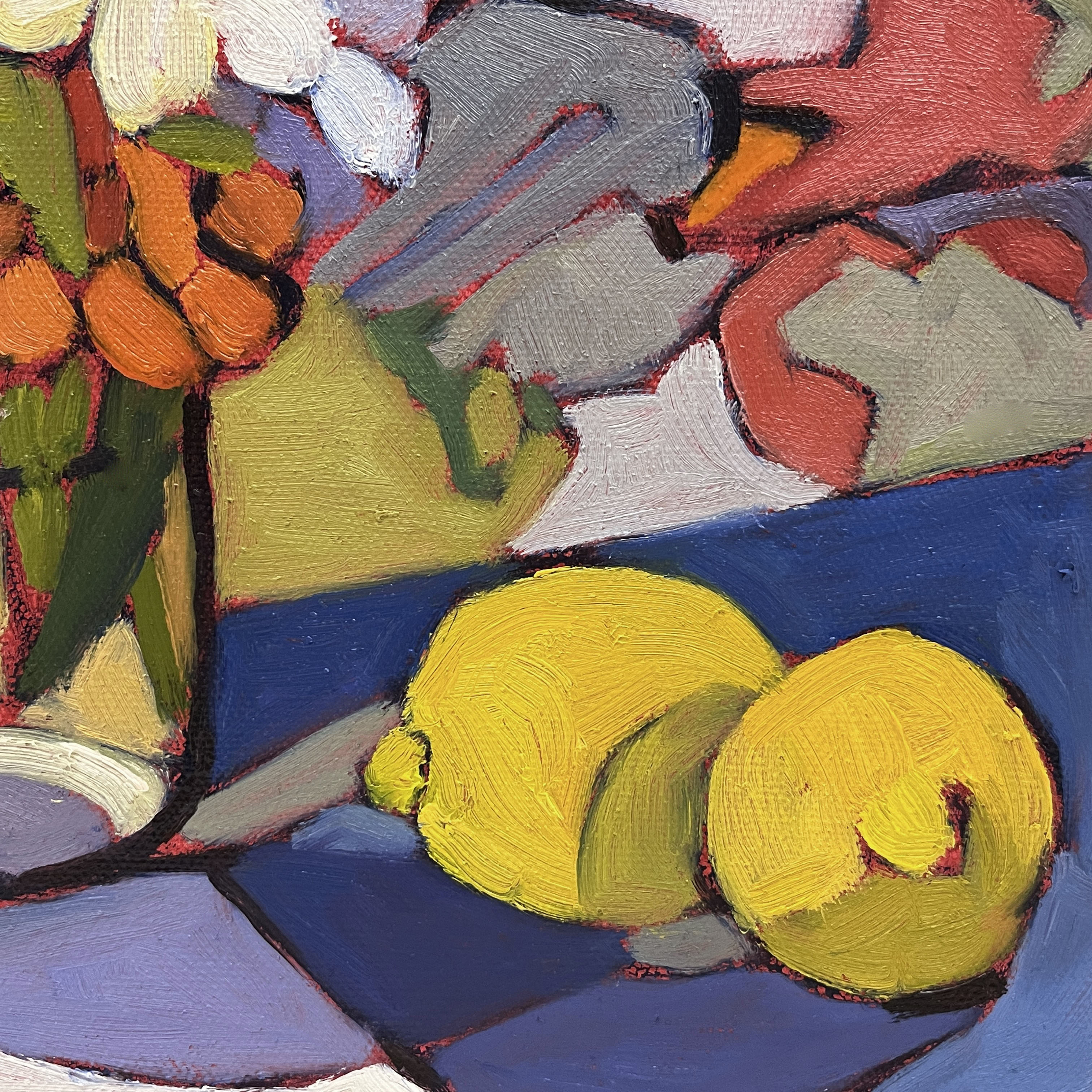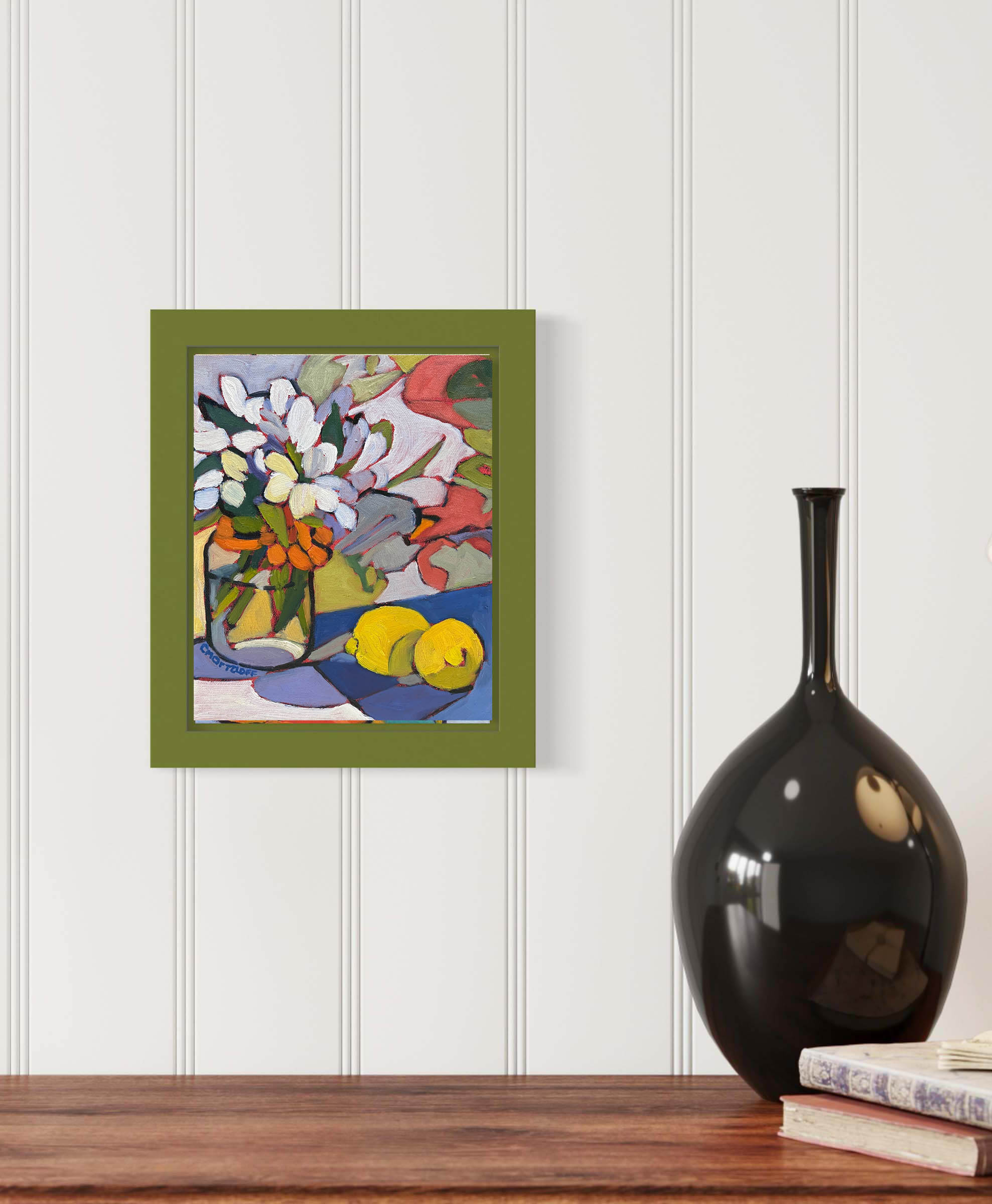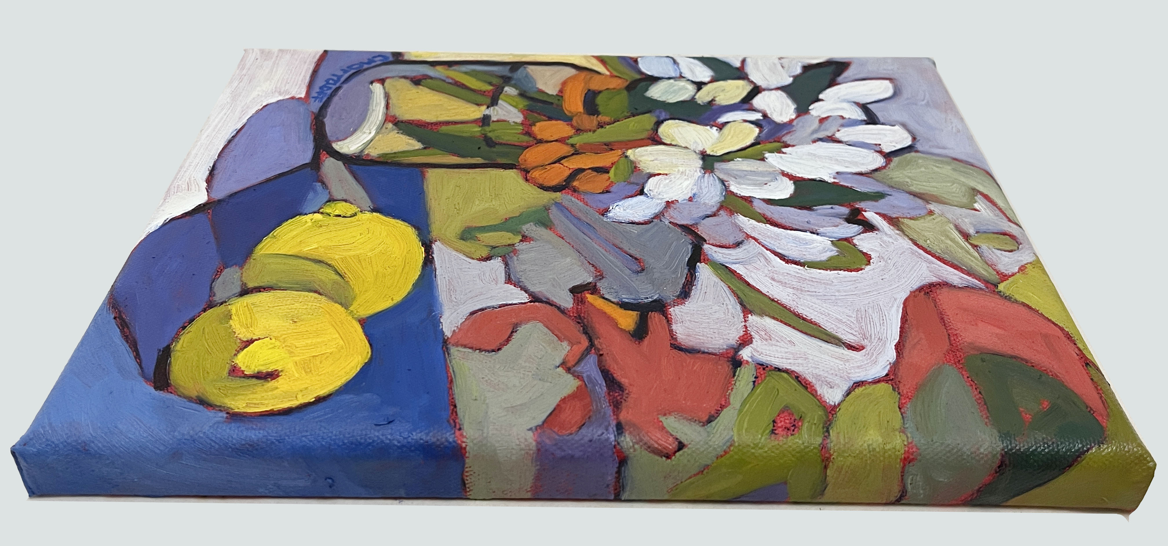 Abstracted Garden is a play on a garden within a garden—a world within a world. This painting experiments with the idea of layers, where reality and abstraction intermingle. The alstroemeria, placed simply in a glass canning jar, bring a fresh vibrancy, while the background—an abstracted glimpse of another painting—adds a sense of movement and intrigue. The lemons punctuate the composition with their brilliant yellow, a lively counterpoint to the cooler hues.