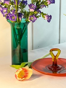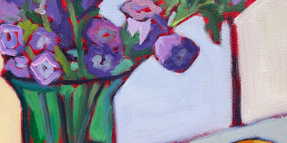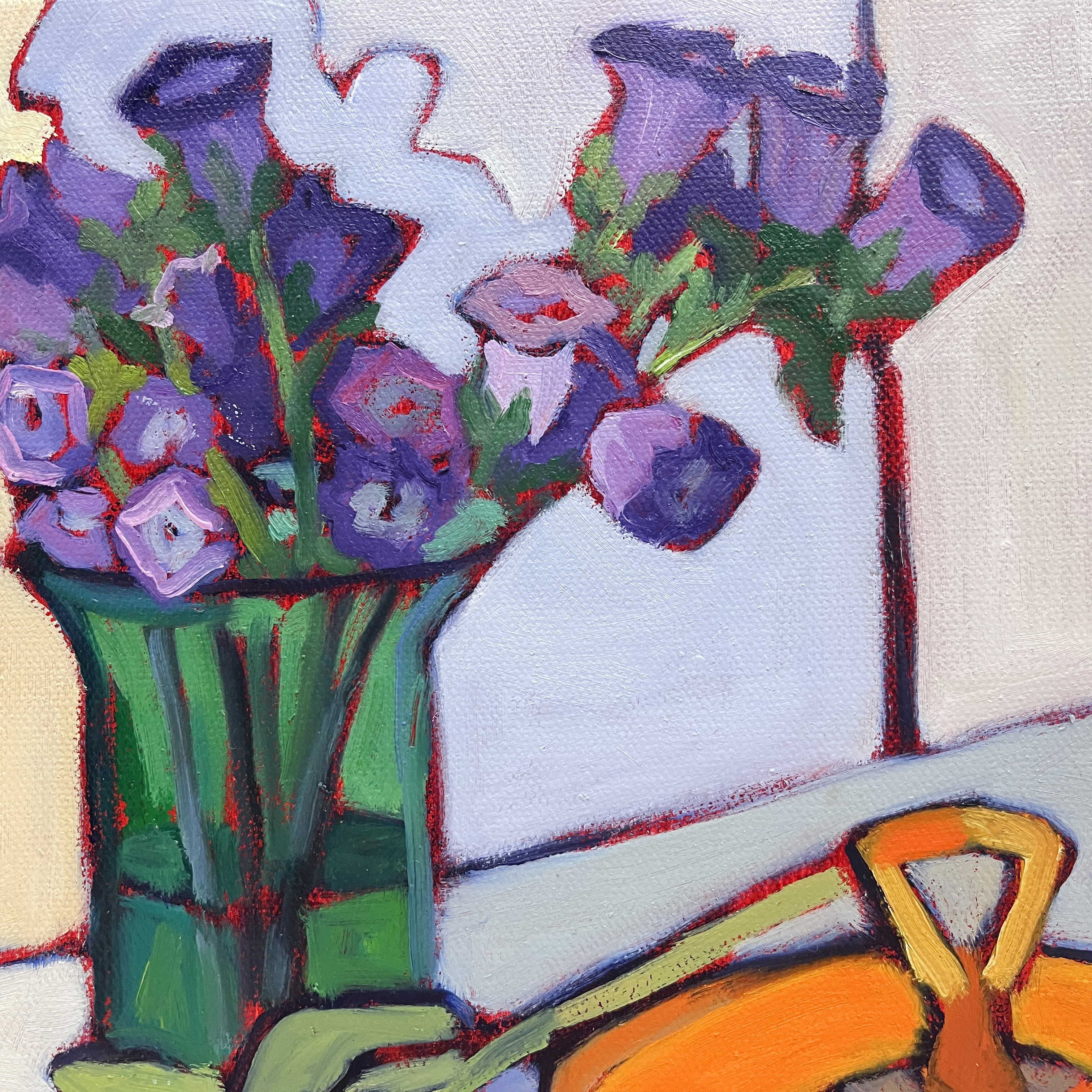 Purple Whispers captures a moment of delicate beauty through bold, expressive brushwork and a luminous palette. A lively bouquet of purple blooms rests in a rich green vase, their shapes playfully abstracted and outlined with rhythmic red accents. A single flower leans gently across the table, bridging the energy of the arrangement with a bright orange vintage serving piece. Against a light, airy background, the composition feels fresh and spontaneous, like a secret conversation between color and form.