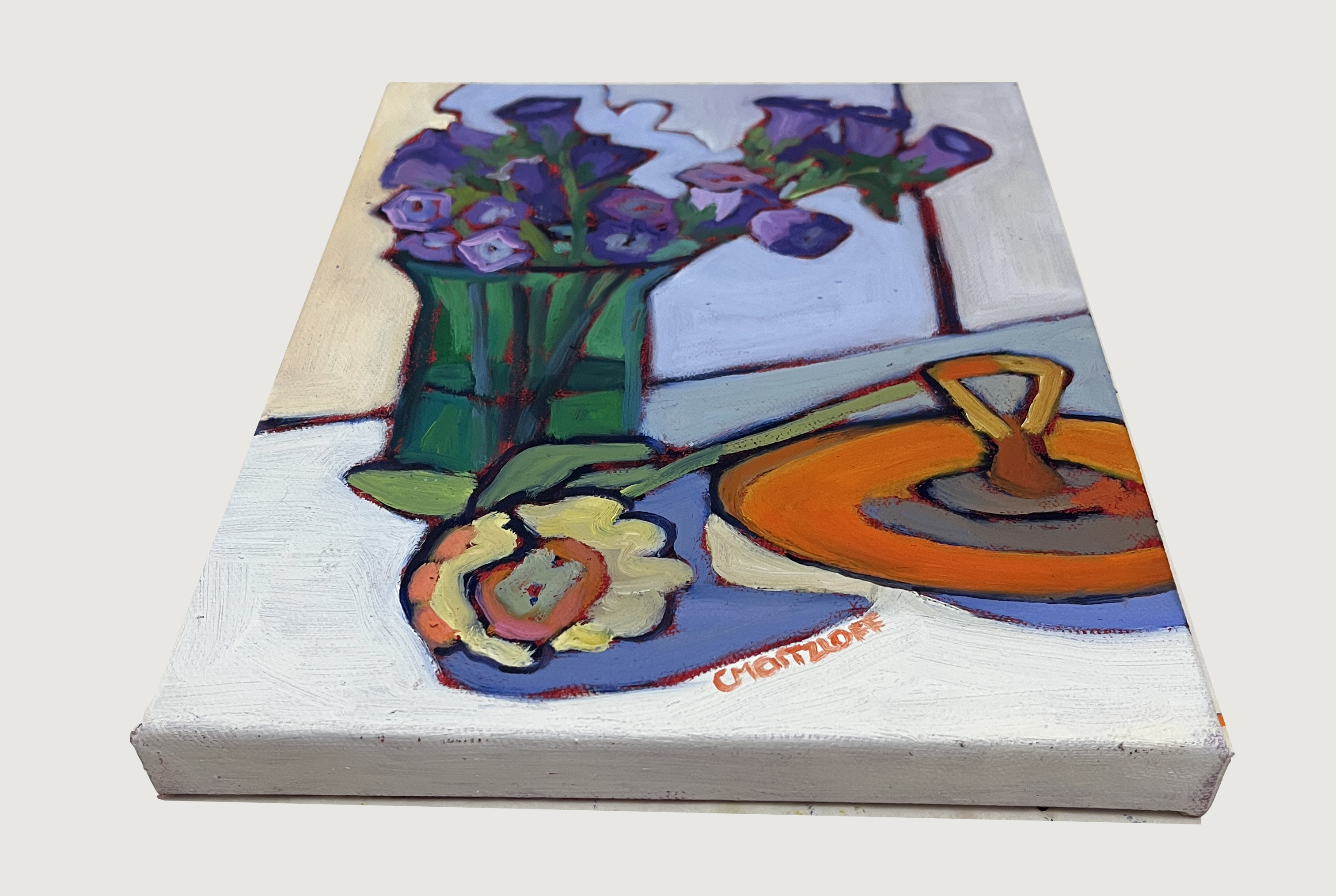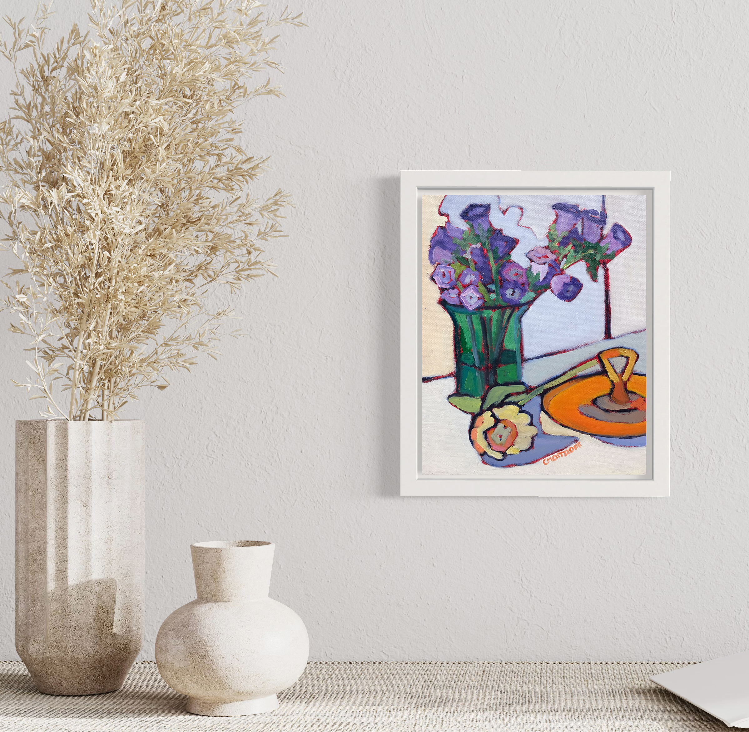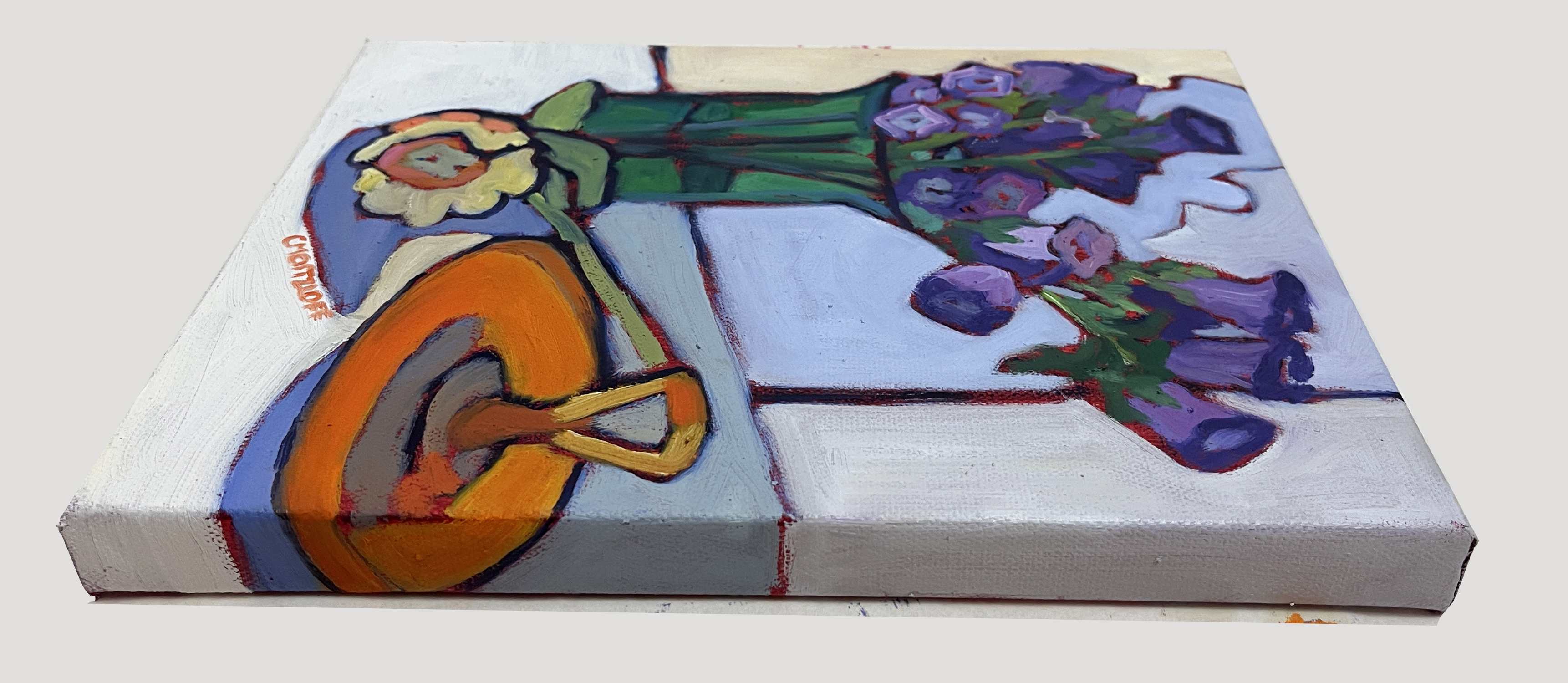 The painting radiates a quiet, joyful energy — a modern still life that honors both the intimacy of everyday objects and the wonder they can inspire. The playful distortions and vibrant contrasts invite the viewer to linger, discovering new details with each glance. Purple Whispers brings a spirited sense of beauty and warmth to any space, perfect for those who appreciate the magic found in life’s quieter moments.