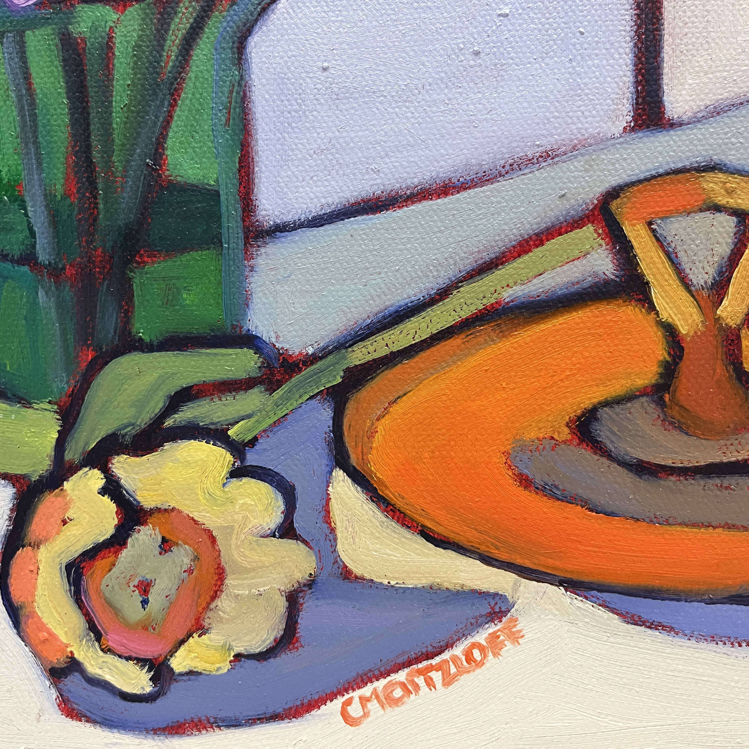 Above you can see the set-up I was working from. The green vase was taller than what I ended up visualizing in the painting. Sometimes when there is tall vertical piece in an arrangement find it can leave too much open space. I experimented! By cropping the vase the connection of the flowers and other objects was brought into greater unity.