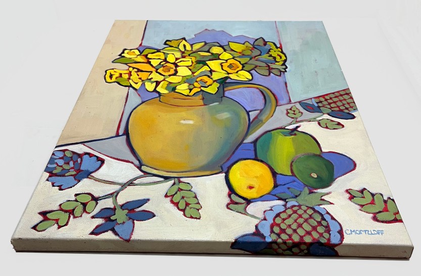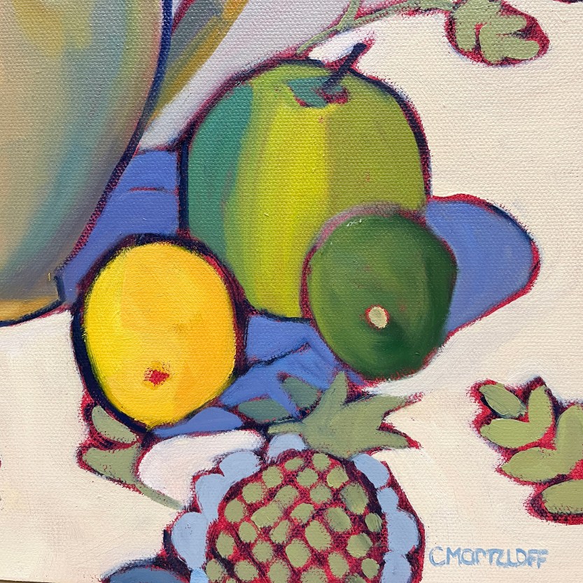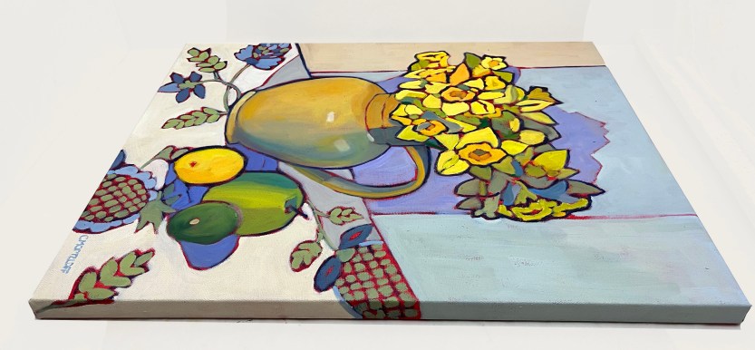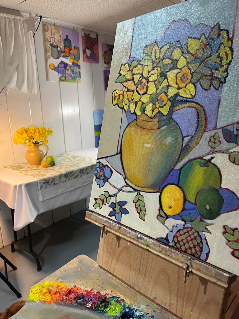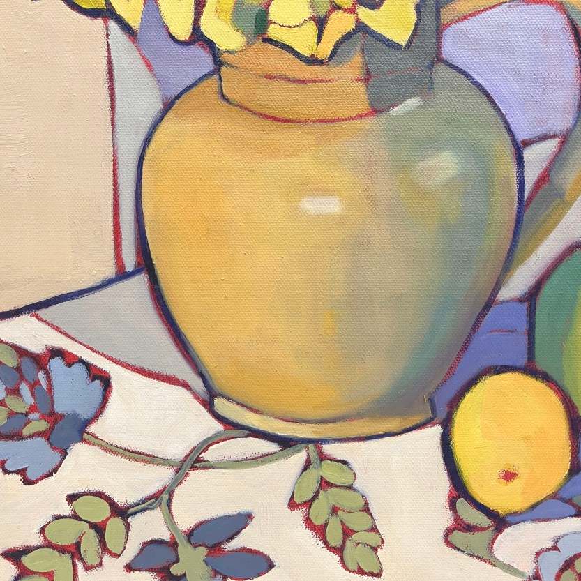 The arrangement came together on a quiet morning with a friend, who brought over some vintage fabric swatches to explore. We chose a blue and cream patterned cloth that hinted—at least to me—of pineapples, though that wasn’t the actual motif. It lent a gentle energy and structure to the composition, and provided a nice balance to the vibrant yellow blooms. A green apple, lemon, and lime rounded out the scene, offering both color harmony and a grounded everyday presence. The tan pottery jug is one I’ve returned to many times in my still life work. Familiar and well-loved, it feels like a conversation partner—each time I paint it, I notice something new.