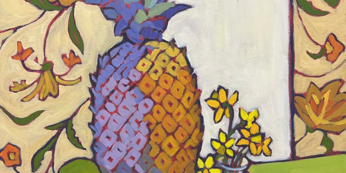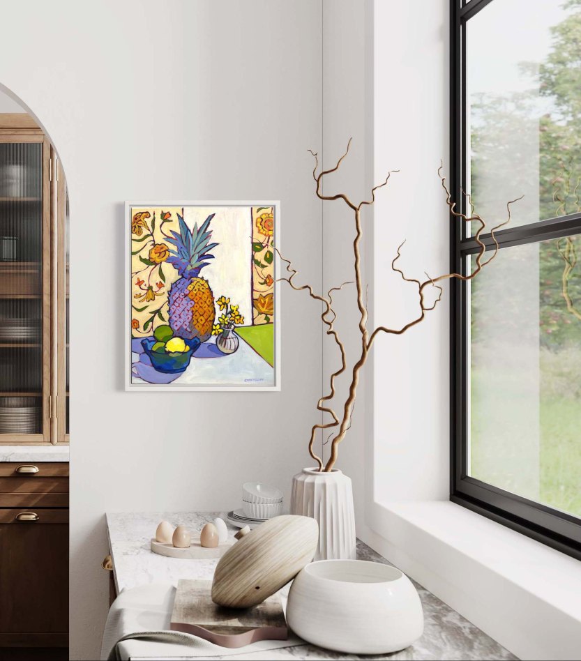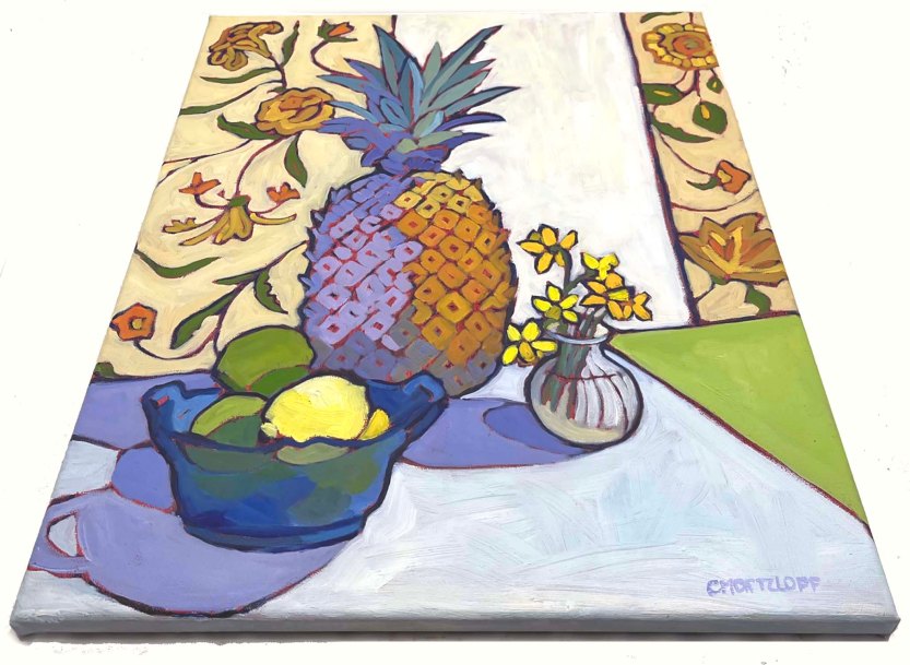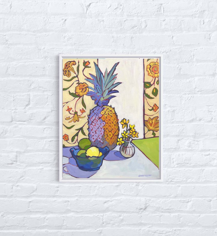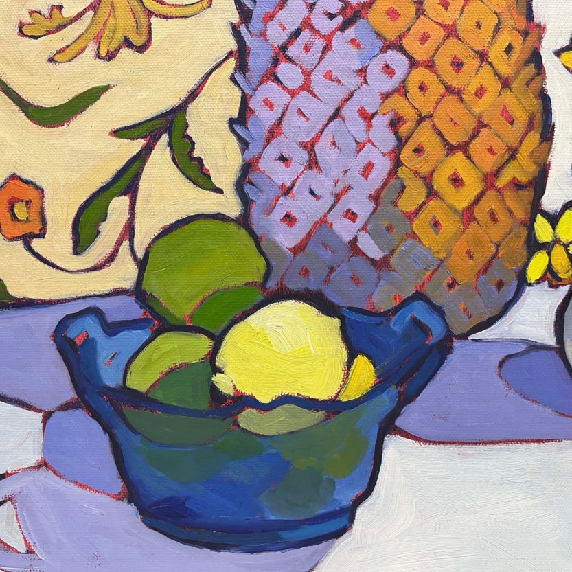 This painting brings me back to a time when I managed a gourmet kitchen store — a place where I first learned that pineapples symbolized hospitality, warmth, and welcome. Painting this piece connected me to that symbolism in a deeply personal way. The rich texture of the pineapple’s diamond-patterned skin and its glowing, warm tones offered something both grounding and joyful to work with.