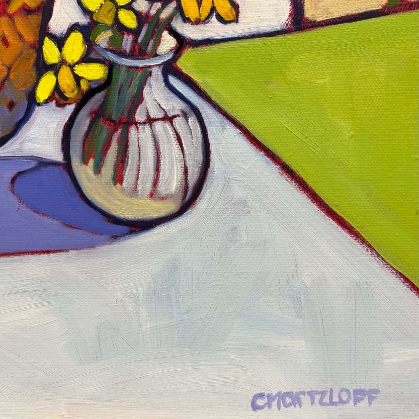 As I painted, memories of “home” crept in — not just the physical place, but the feeling of it. That sense is echoed in the floral fabric that frames the composition. Fabric always reminds me of my mother, who sewed constantly. I still picture her at her machine, fully absorbed in her own rhythm of making. The cobalt blue bowl of citrus, the tiny vase of early daffodils… they carry their own small stories too. The daffodils especially — they bloom for only a brief time, just as spring begins to take hold. I remember them growing in our yard in Westfield.