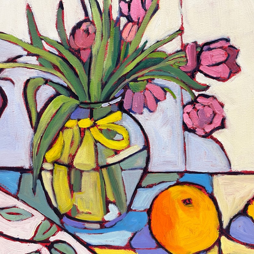 This painting captures a lively gathering of tulips in full bloom, their curved stems and blushing petals bursting from a clear vase tied with a cheerful yellow ribbon. Set against warm panels of sunlight and softened whites, the composition evokes the charm of a cozy kitchen table moment. A lemon and orange offer a vibrant balance to the pink blossoms, anchoring the scene with their round forms and rich color.