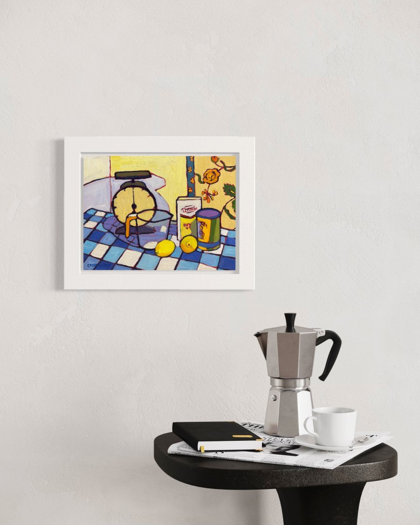 Back in the kitchen, surrounded by vintage treasures and the gentle hum of creativity—that’s where this still life finds its heart. A classic blue-and-white cloth lays the foundation, a familiar stage for an arrangement gathered from my cupboard and fridge.