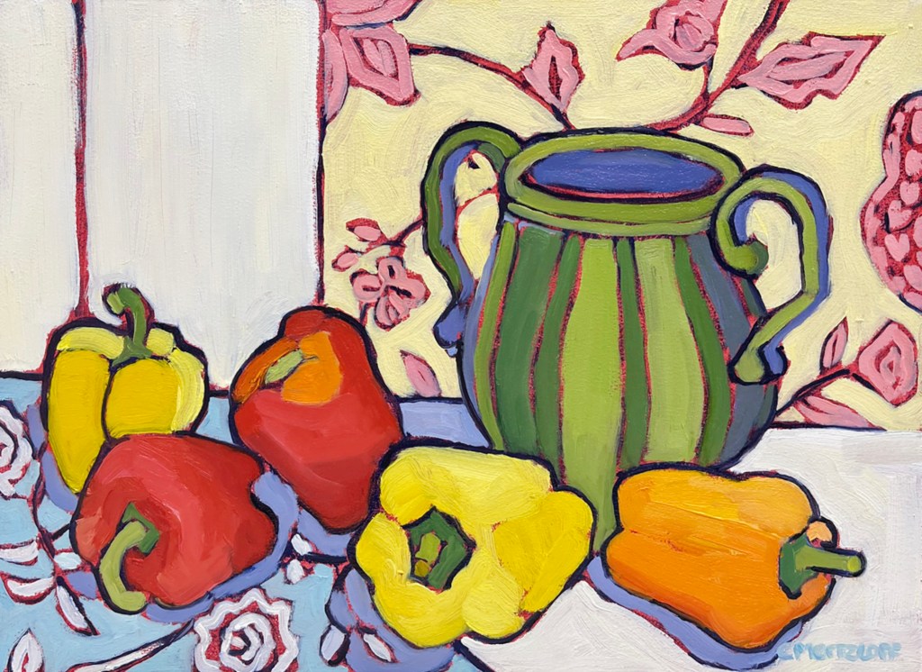 Summer Peppers is a vibrant nod to the joy and abundance of the warmer months—a still life that captures the essence of everyday beauty through fresh seasonal color and playful pattern. Radiant peppers and floral motifs come together in a composition that celebrates both simplicity and thoughtful design.