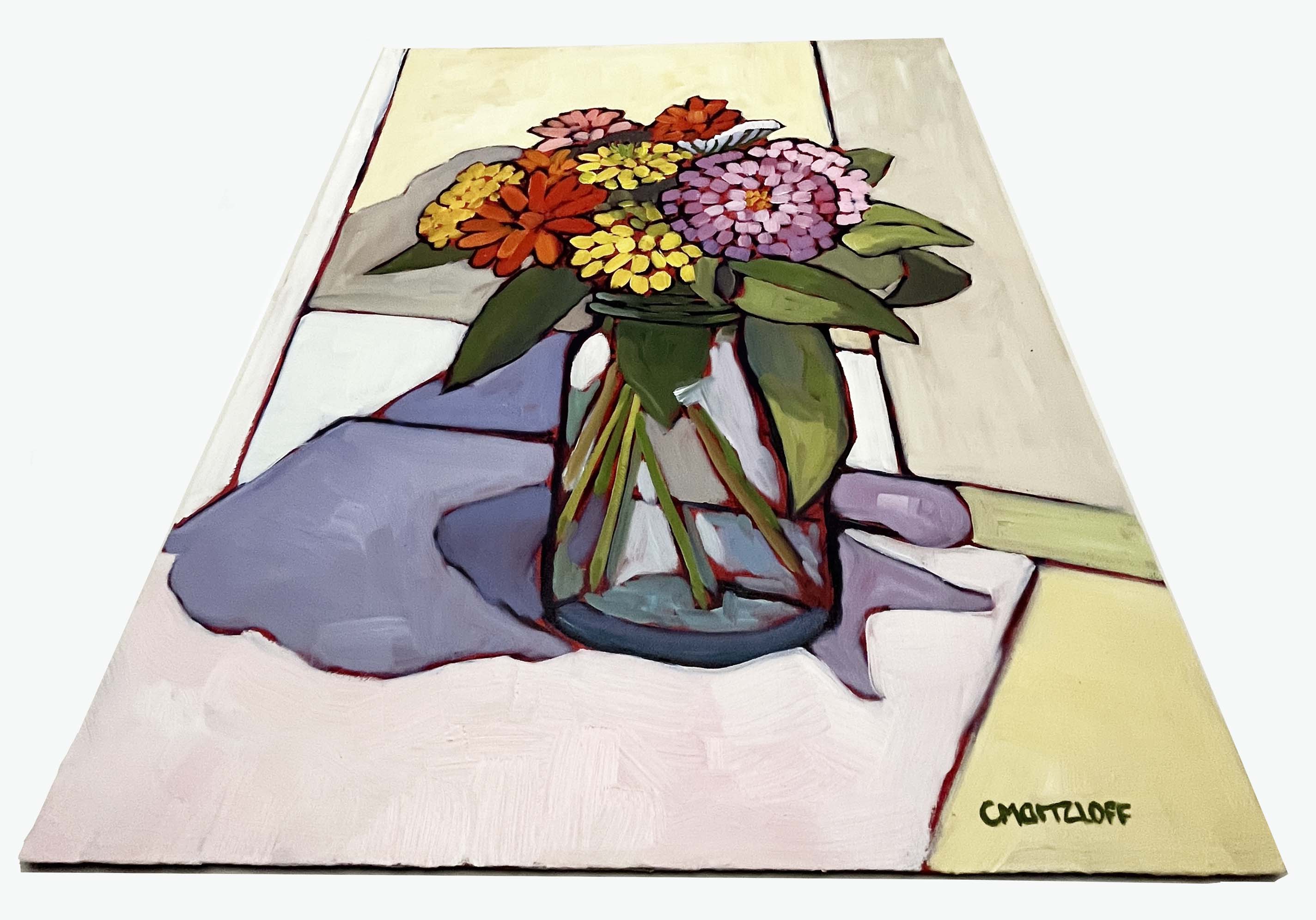 Sunlit Zinnias invites you into a world of radiant color and the quiet joy of a room touched by nature. This 20″ x 16″ oil painting centers around a vintage glass canning jar—humble, familiar, and full of meaning—cradling a fresh bouquet of zinnias gathered from the garden. The blooms spill outward, leaves trailing gently, as if leaning into the light.
