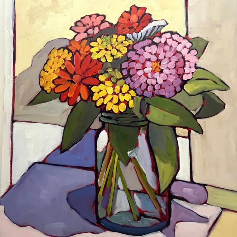 Flowers often find their way into my work, not only for their beauty but for the wonder they bring into the everyday. Vintage canning jars, with their soft curves and history, speak to a slower, more rooted way of living—something I often aim to express in paint.