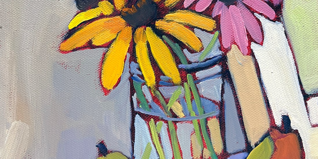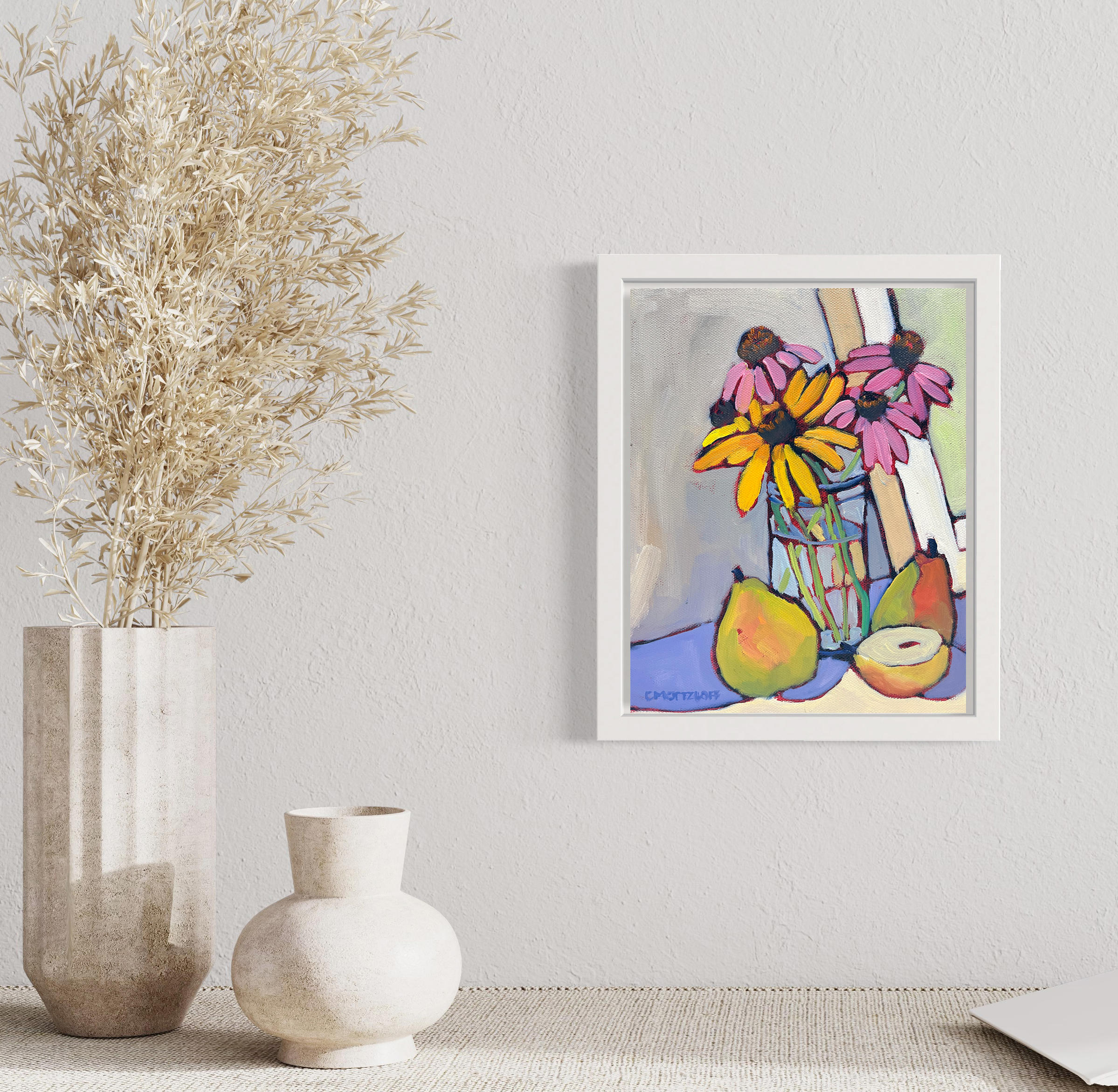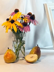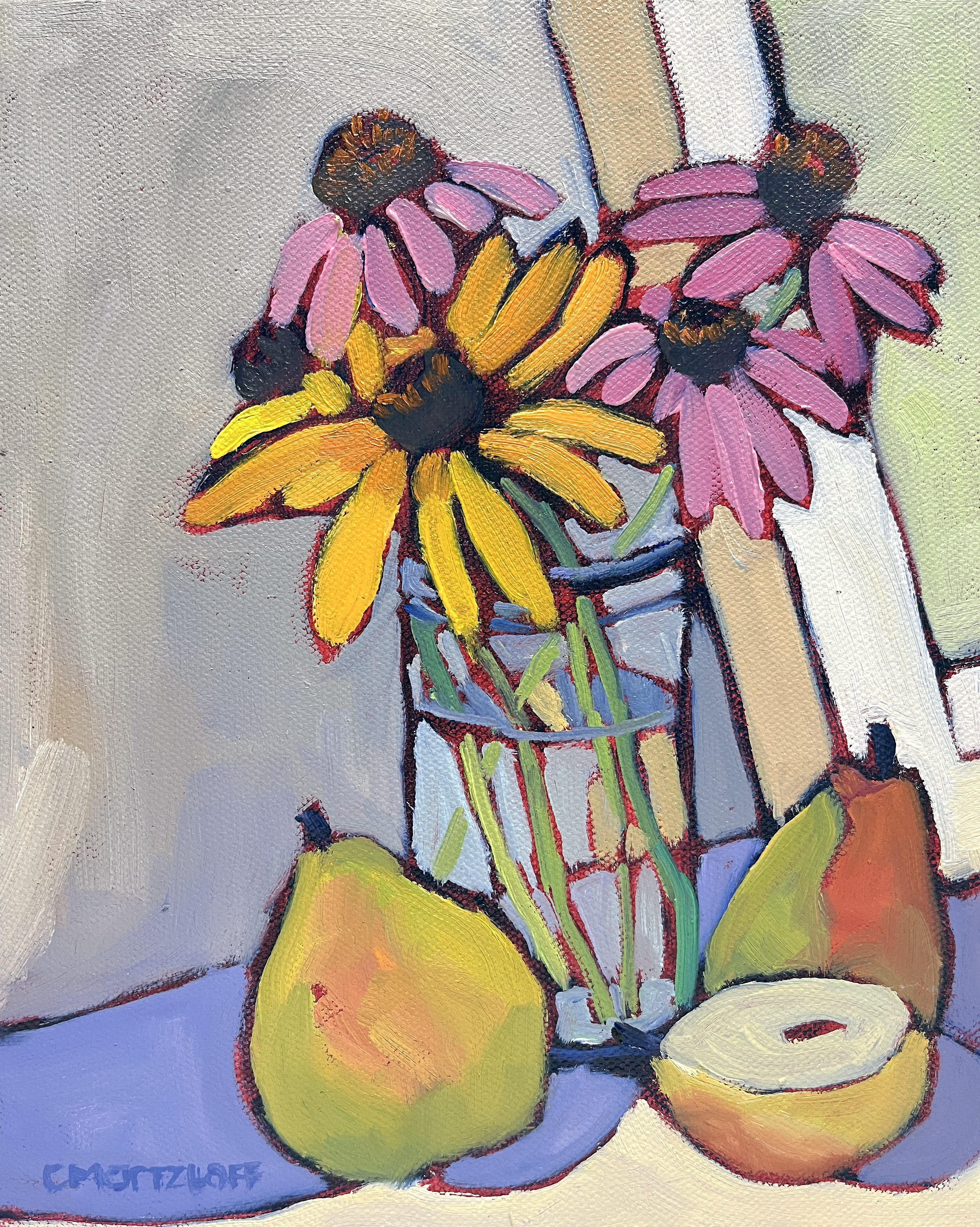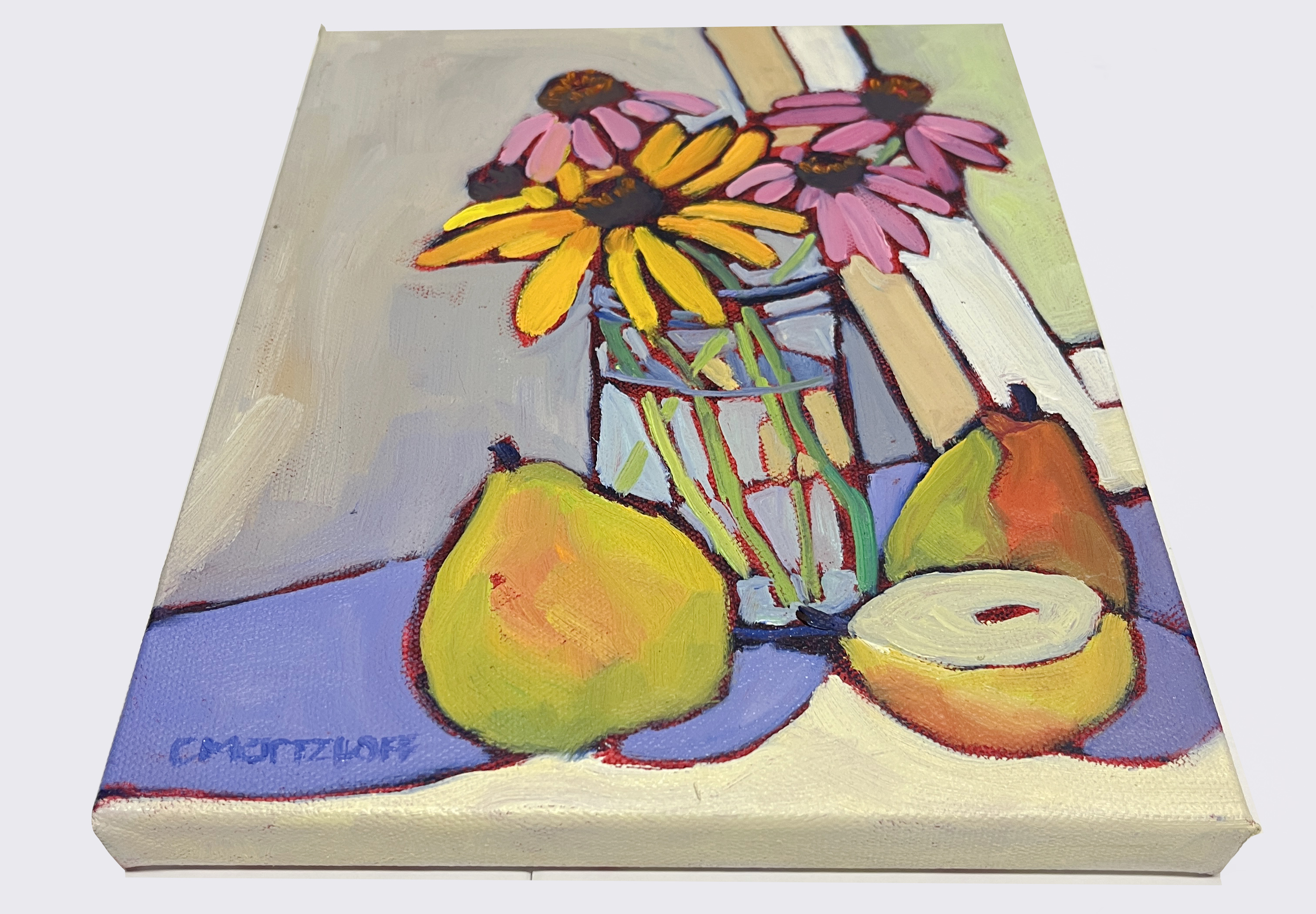 This painting came together on a slow, sunny afternoon just two weeks ago. A friend arrived at my studio door with a bundle of freshly cut purple and yellow coneflowers. She also brought some radiant zinnias from her garden. We ended up choosing the coneflowers for this still life, pairing them with a few pears. Something about the pairing felt earthy, generous, and full of late-summer life.