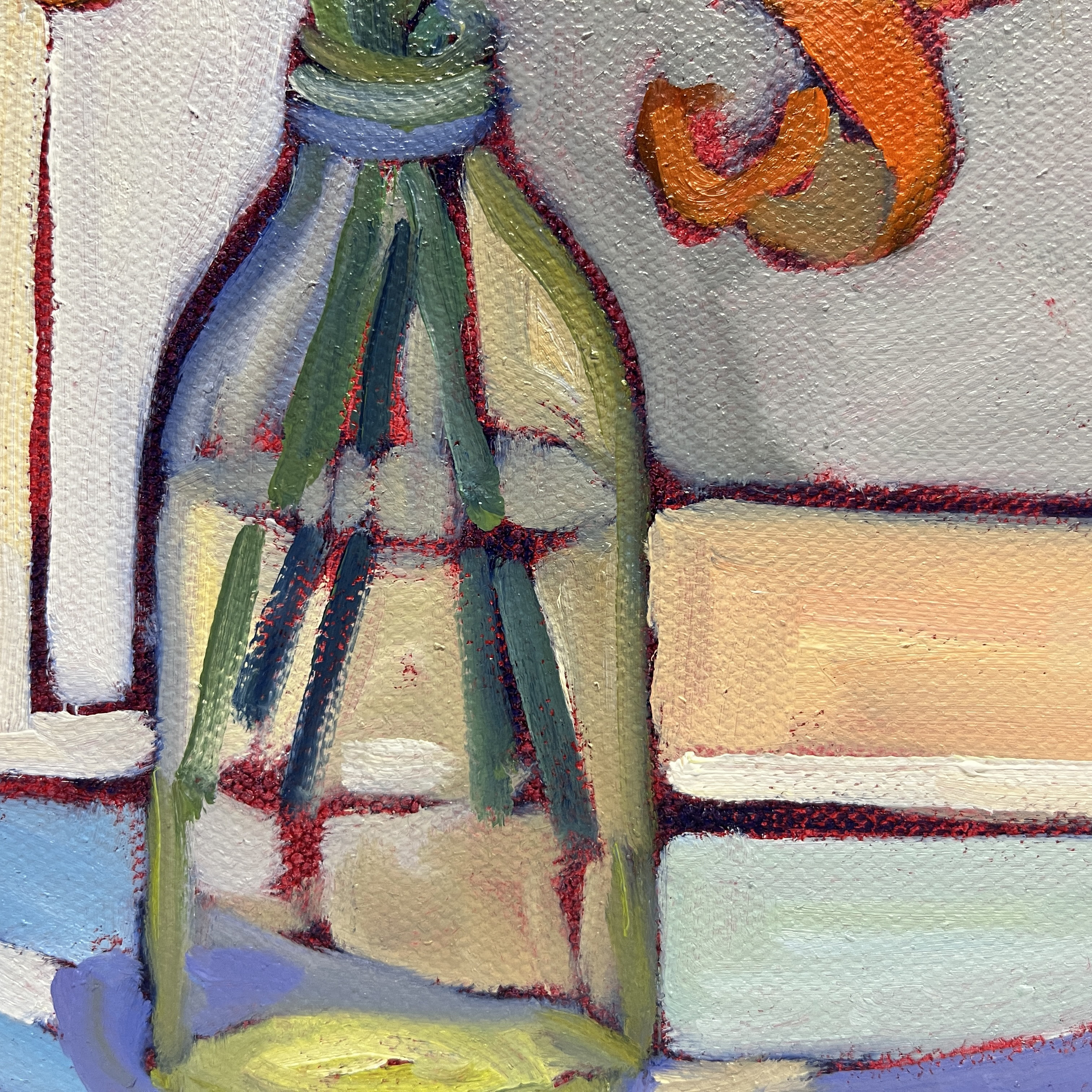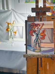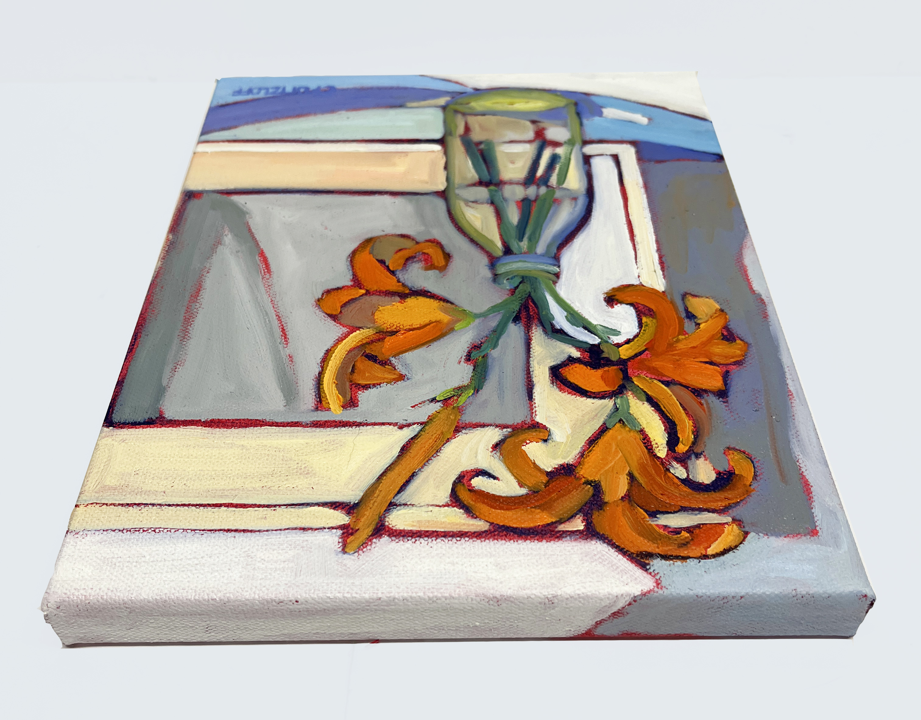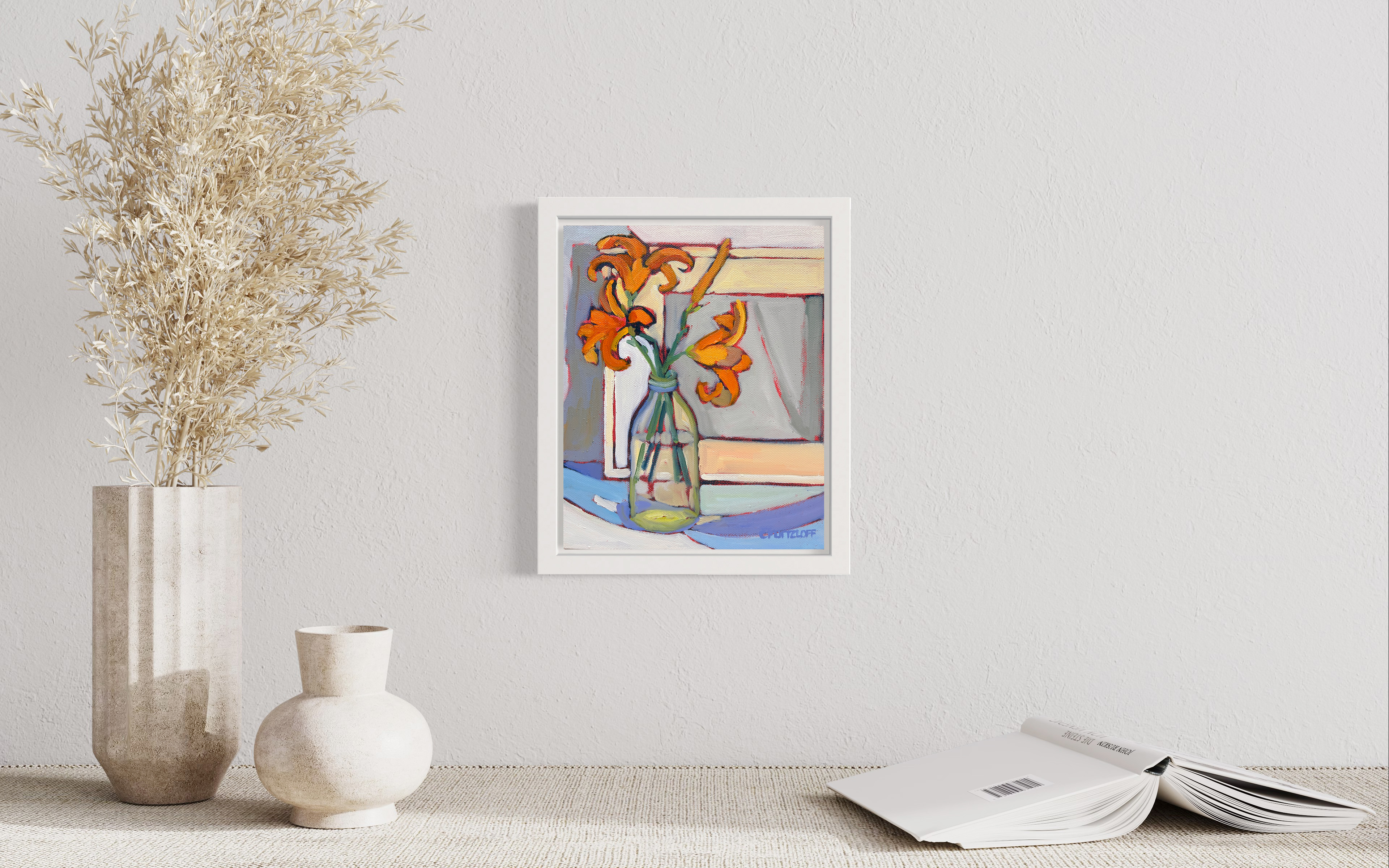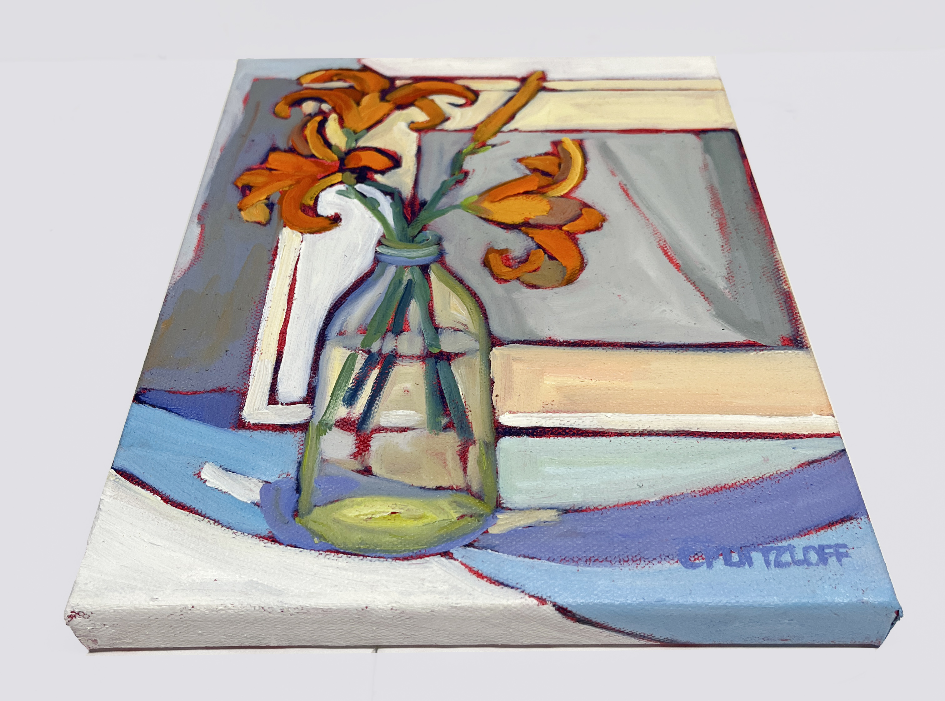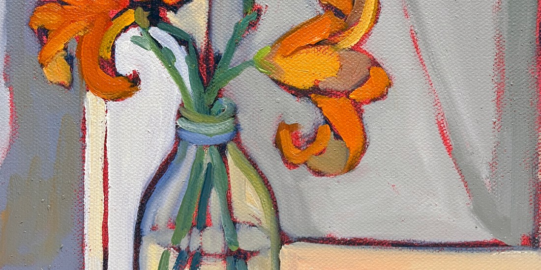 This painting came together quickly. It was one of those sessions where I trusted the gesture. I let the brush move without too much second-guessing. The setup was simple: a trio of blooms gathered in a bottle, warm light drifting across the table. I enjoy the shapes of these lilies—the curves, twists, and open petals. They practically paint themselves in a bold palette. That orange is such a joyful color. Just when the spring blooms fade, these show up with their own energy. A little unruly. A little celebratory.