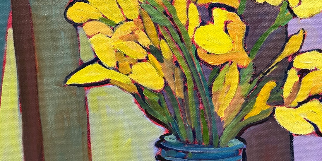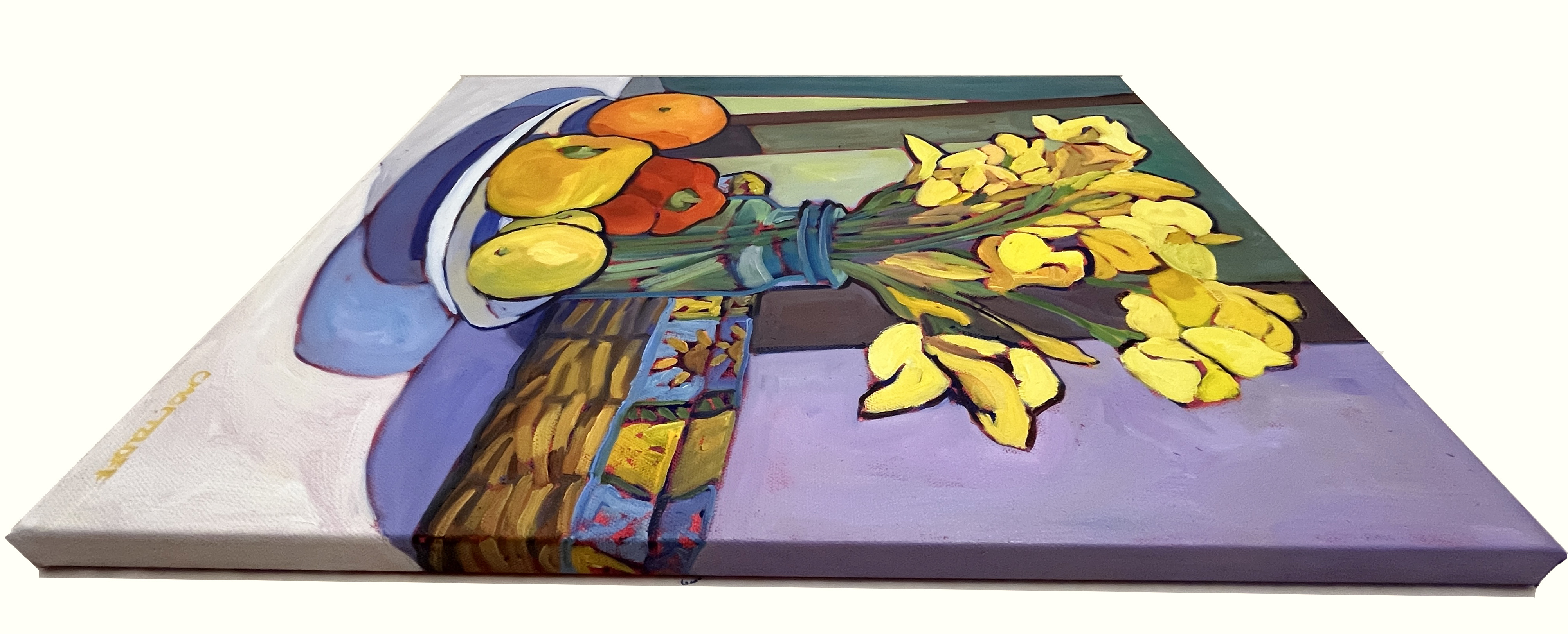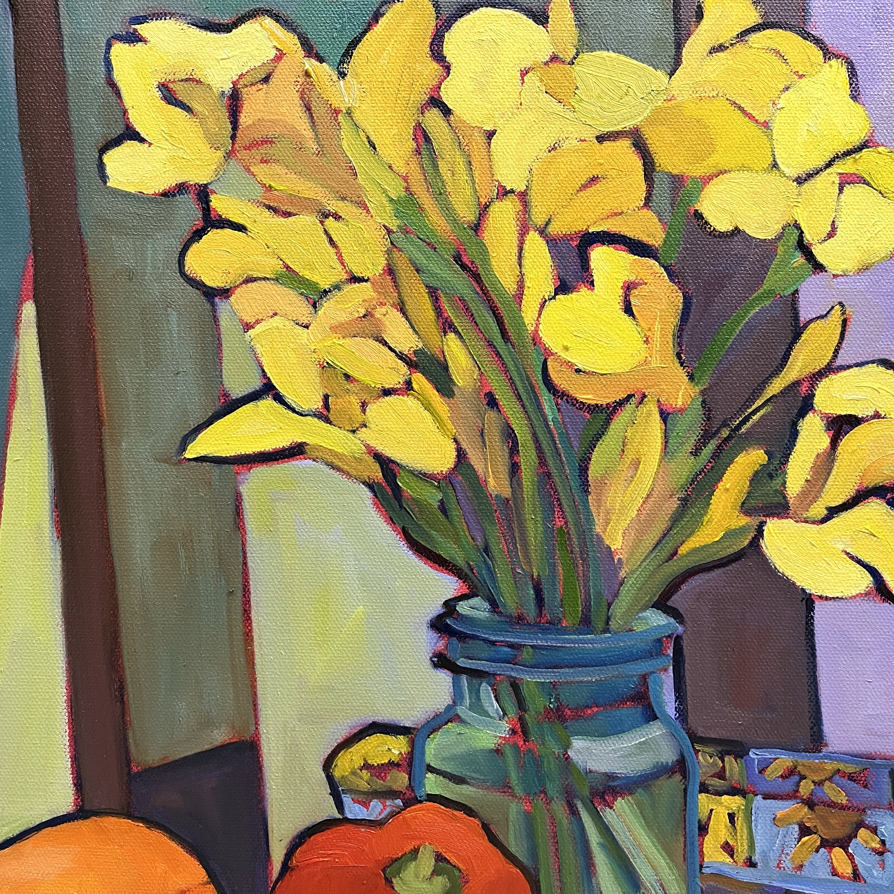 Sunlight pours across a humble kitchen table in the painting “Daylight and Memories”. It catches the bright faces of golden flowers. The painting also highlights the warm tones of apples and citrus fruit. Daylight and Memories captures an awareness of the everyday. It focuses on highlighting the beauty and artistry within things that often go unnoticed. The familiar objects—a mason jar, a basket, a collection of fruit—speak to rituals of nourishment and home. And a bouquet of flowers that transforms the entire experience.