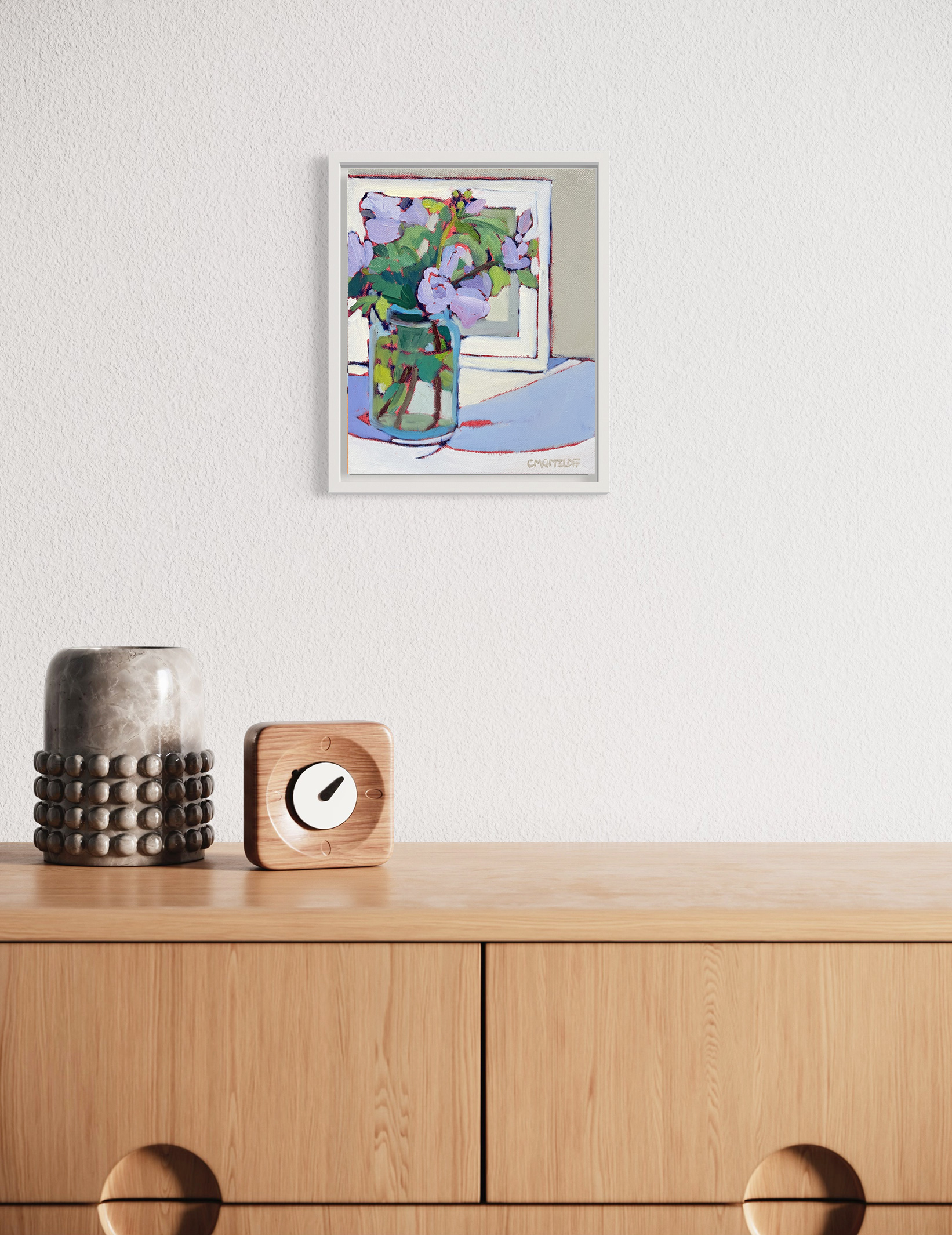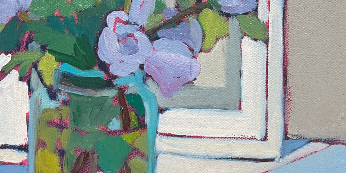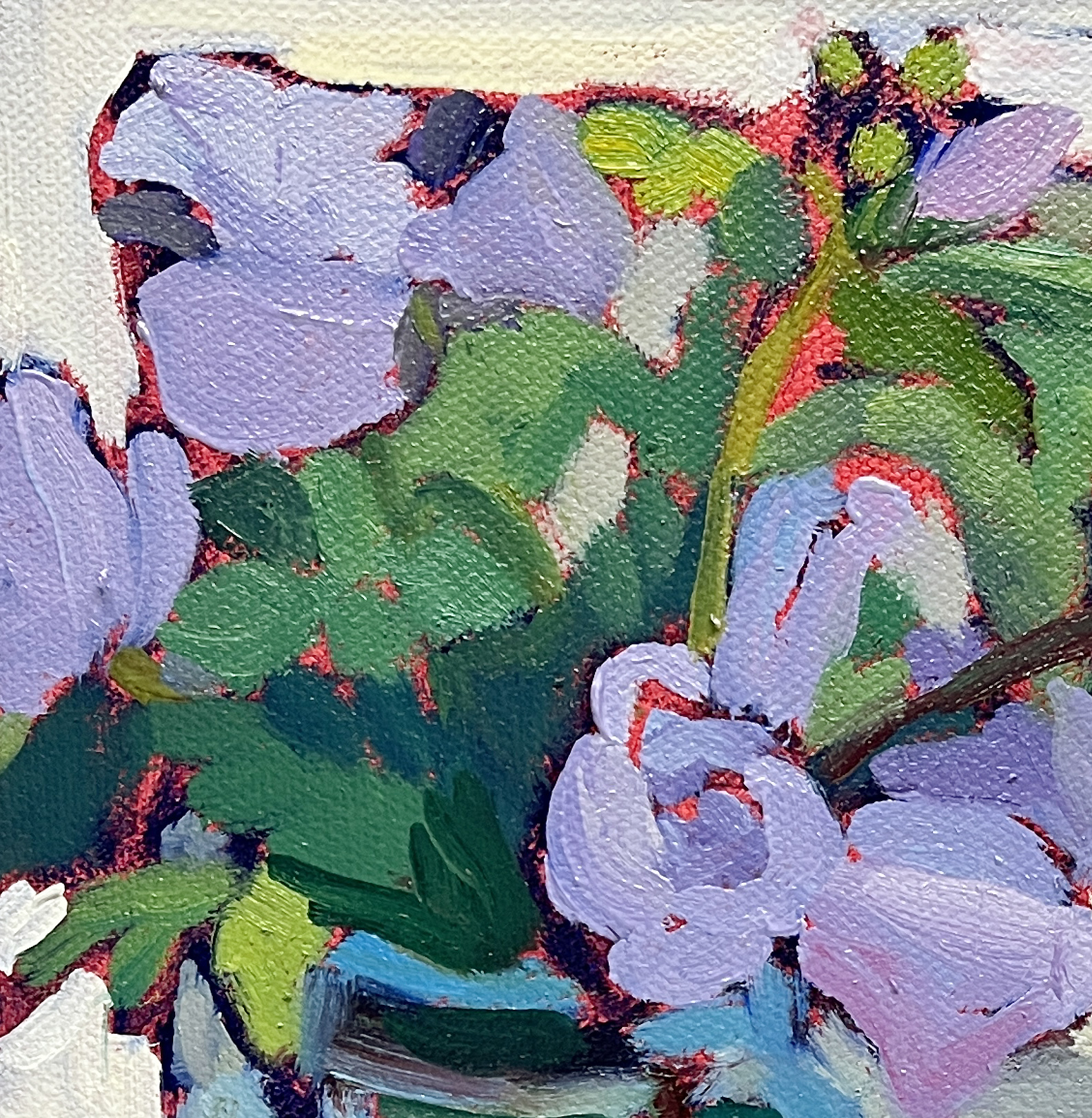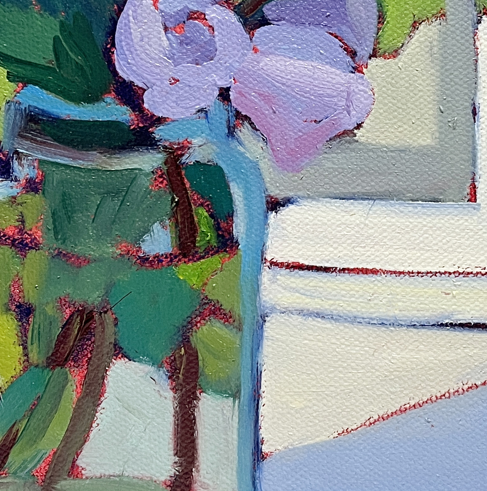 When contemplating this still life the idea of working with Rose of Sharon felt appealing. The one I have has a beautiful palette of blue, soft violet and purple flowers. It’s a soothing offering in terms of a palette. Of course my dad crossed my mind – he passed recently and so did his wife. This experience may have been part of what led me to create the painting.